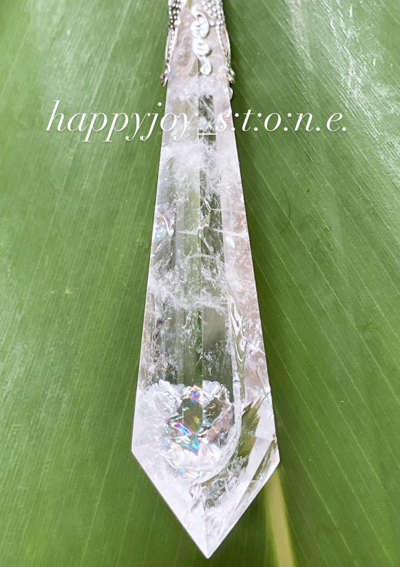 水晶の生成過程において圧力や温度の変化で、結晶内部に歪みや亀裂が生じ、本来の光の屈折率が変化した事で、虹が入っている水晶です。夢を叶える架け橋と言われる虹は調和と安定を意味しています。
