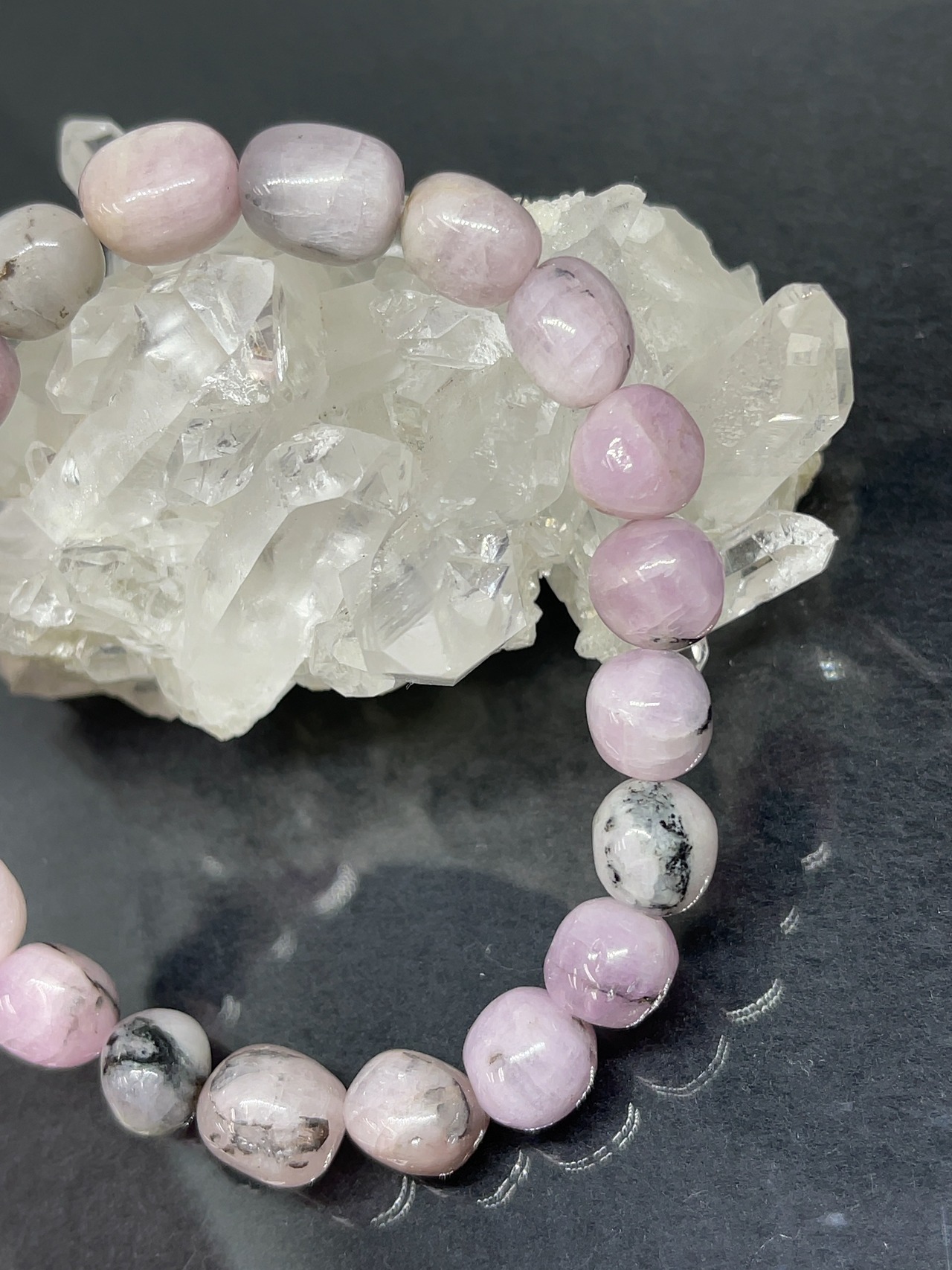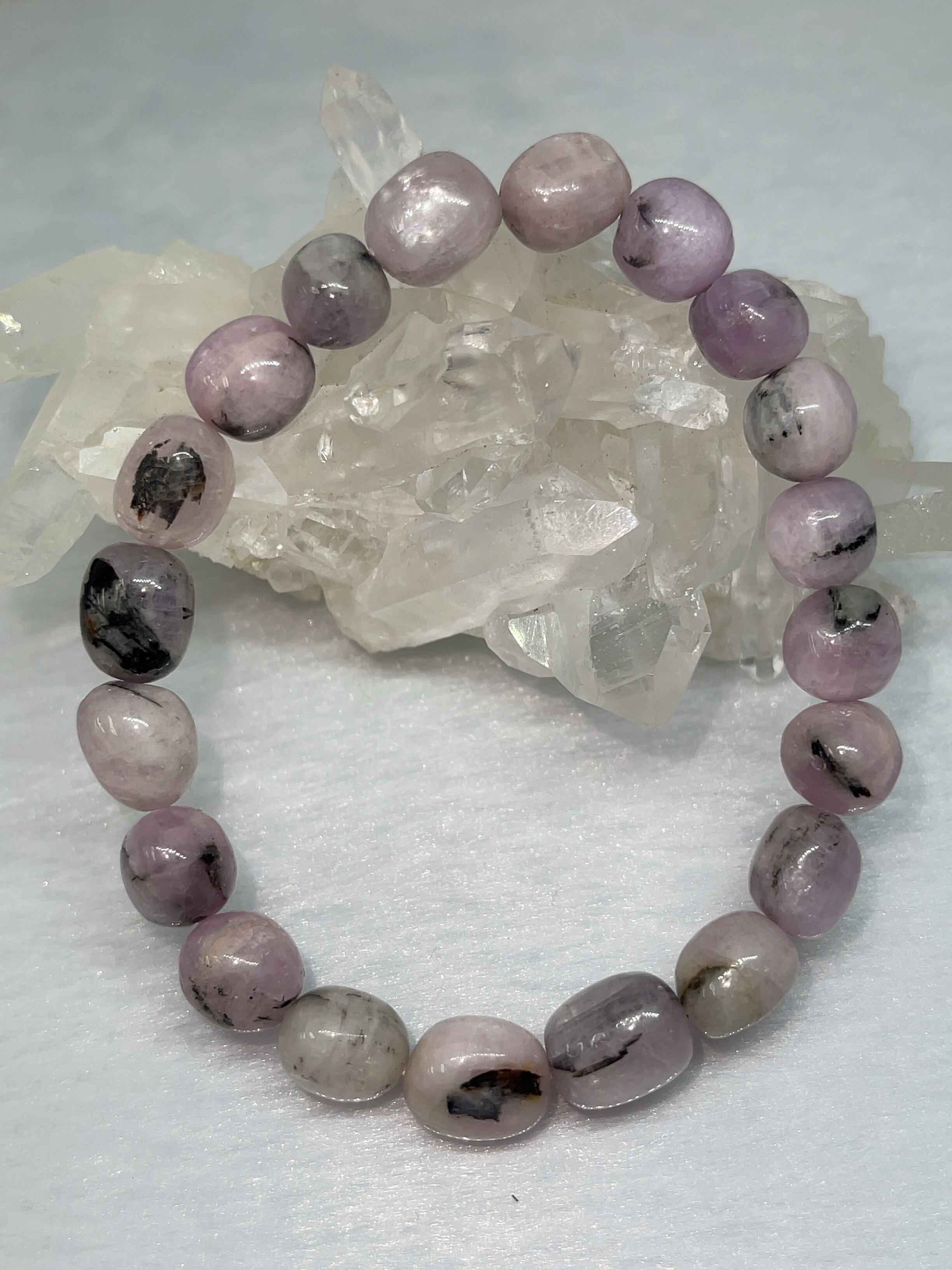 美しいマーブルカラーが示すように、芸術に関する力が強いクリスタルです。白のカルセドニーやオパール、紫のフローライト、ピンクのロードナイトなど、様々な鉱物を含む石でとても希少!
