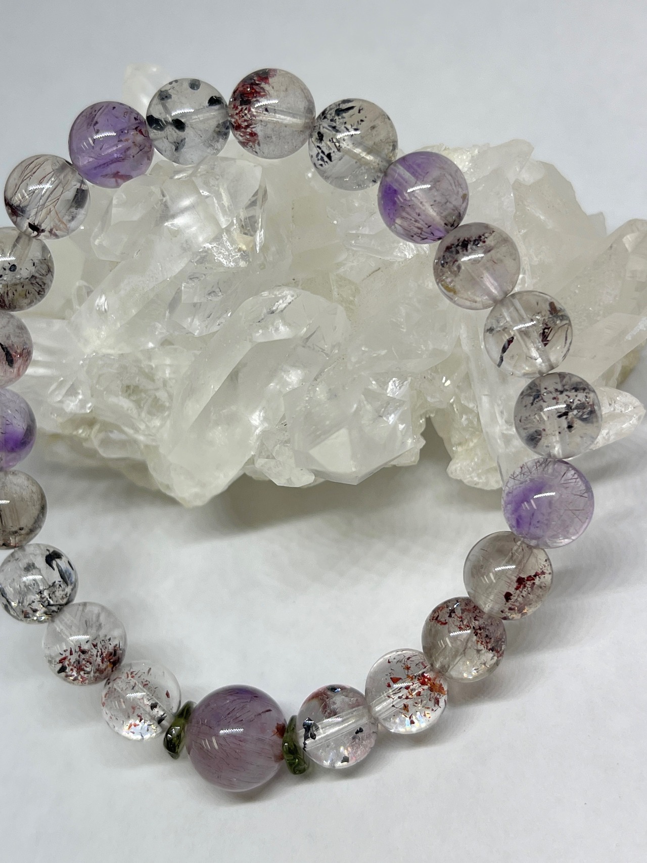 クリスタル、アメジスト、カコクセナイト、ゲーサイト、レピドクロサイト、スモーキークォーツ、ルチルの7種類です。加工後に鉱物が入っていなくても、原石に全て含まれていたなら同等の力を持って持つと言われています。持つ人を選びません。