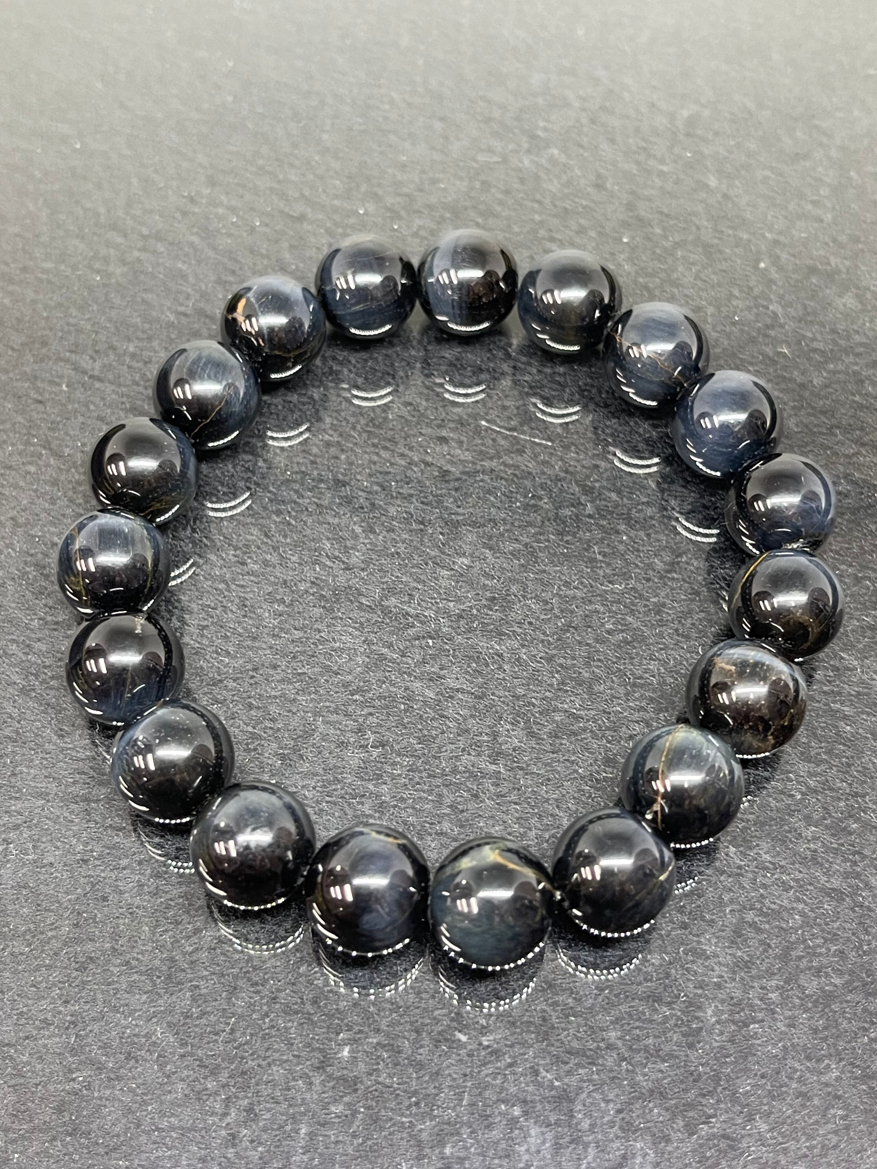 和名「青虎目石」が示すように、タイガーアイよりも青みがかっています。黒地に縞模様が入った石で、研磨すると鷹の目のように見えるものもあります。