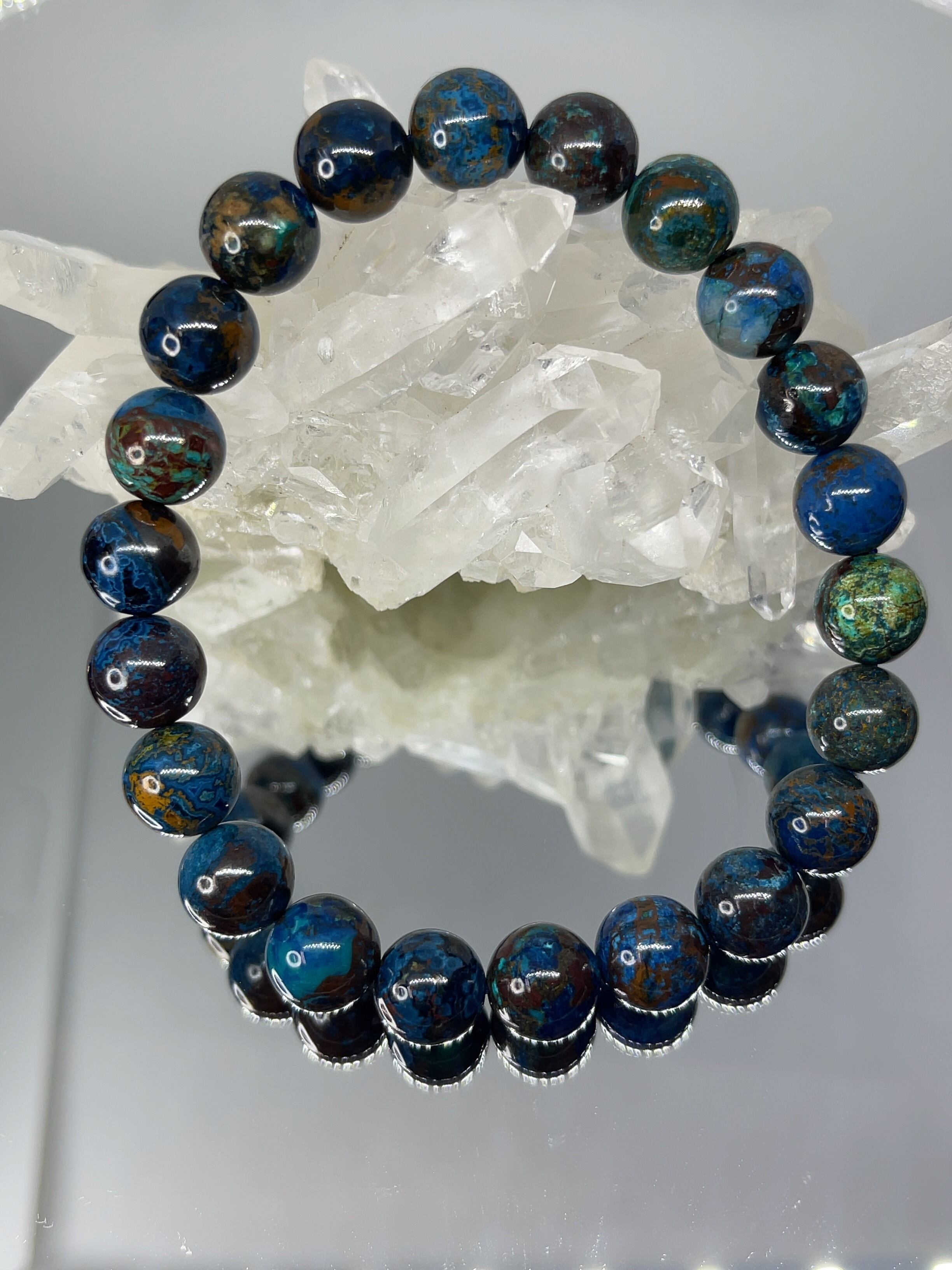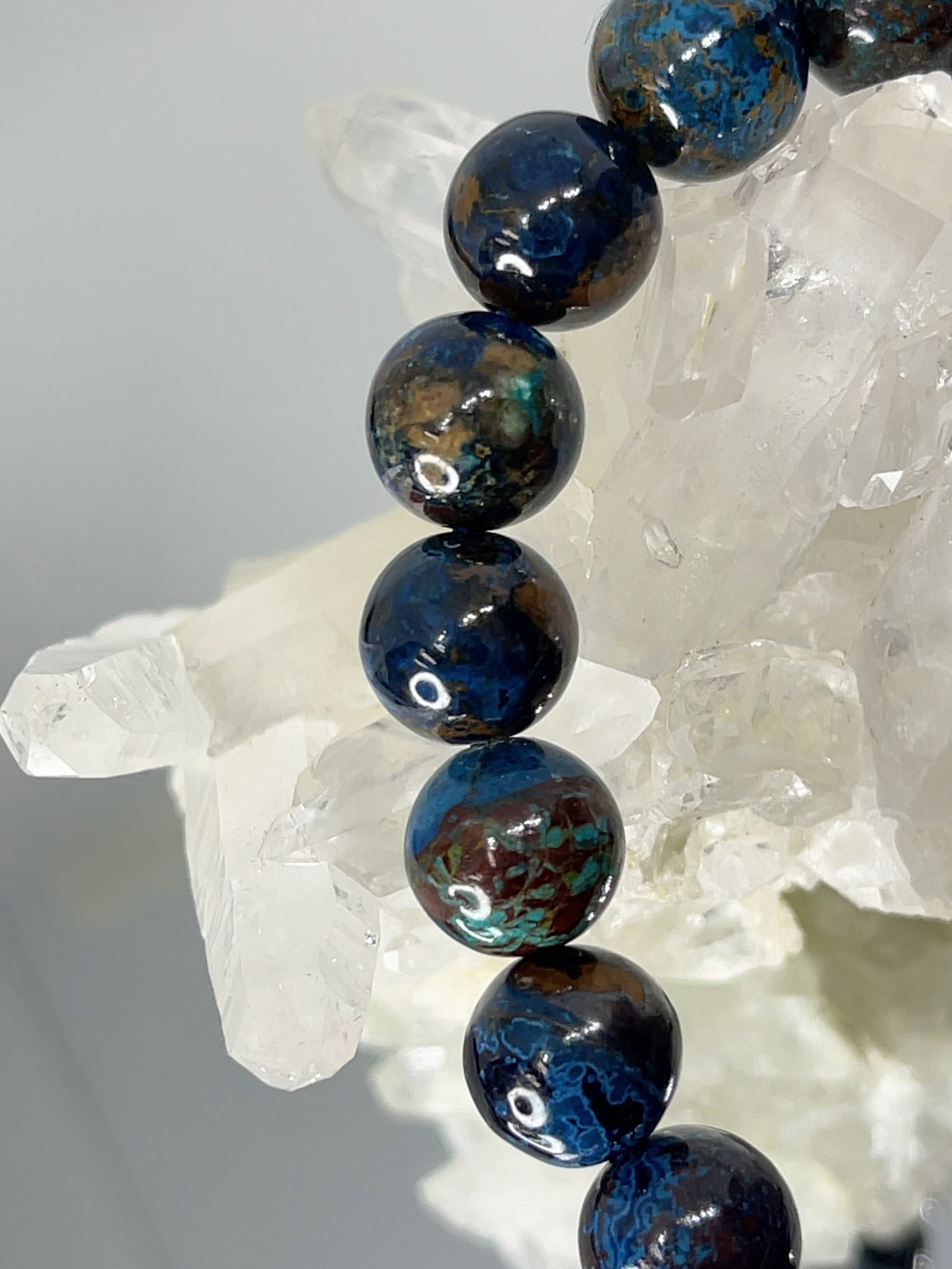 クリソコラと混在して取れることが多いです。クォンタムクワトロシリカと呼ばれるストーンにも含まれています。濃い青と緑色の部分が多く見られる鉱物で、青と緑が混ざり合う神秘的な色彩が特徴です。