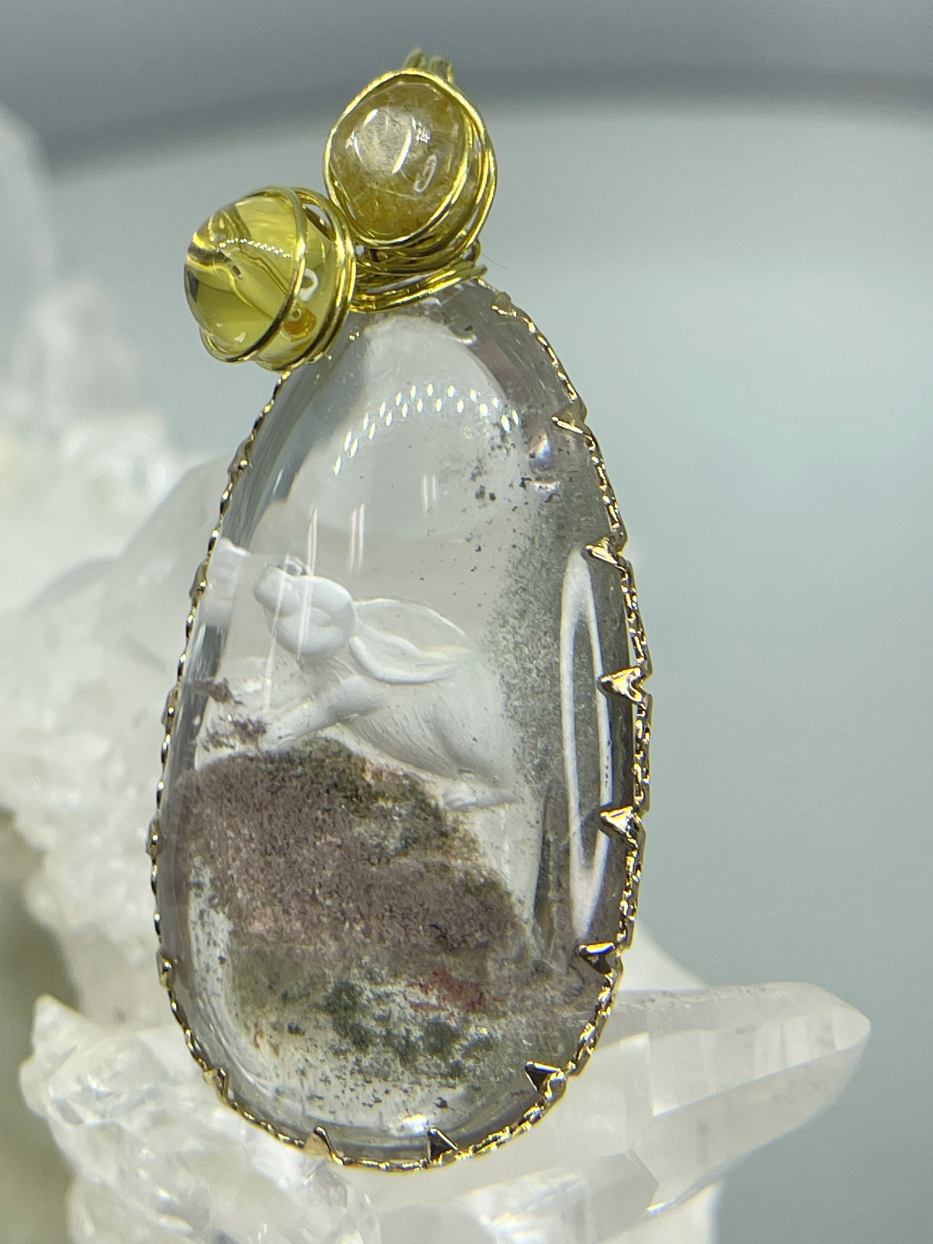 金運UP・財運安定✨☆ウサギ彫ガーデン・ルチルクォーツ・シトリン☆ハンドメイドペンダントトップ