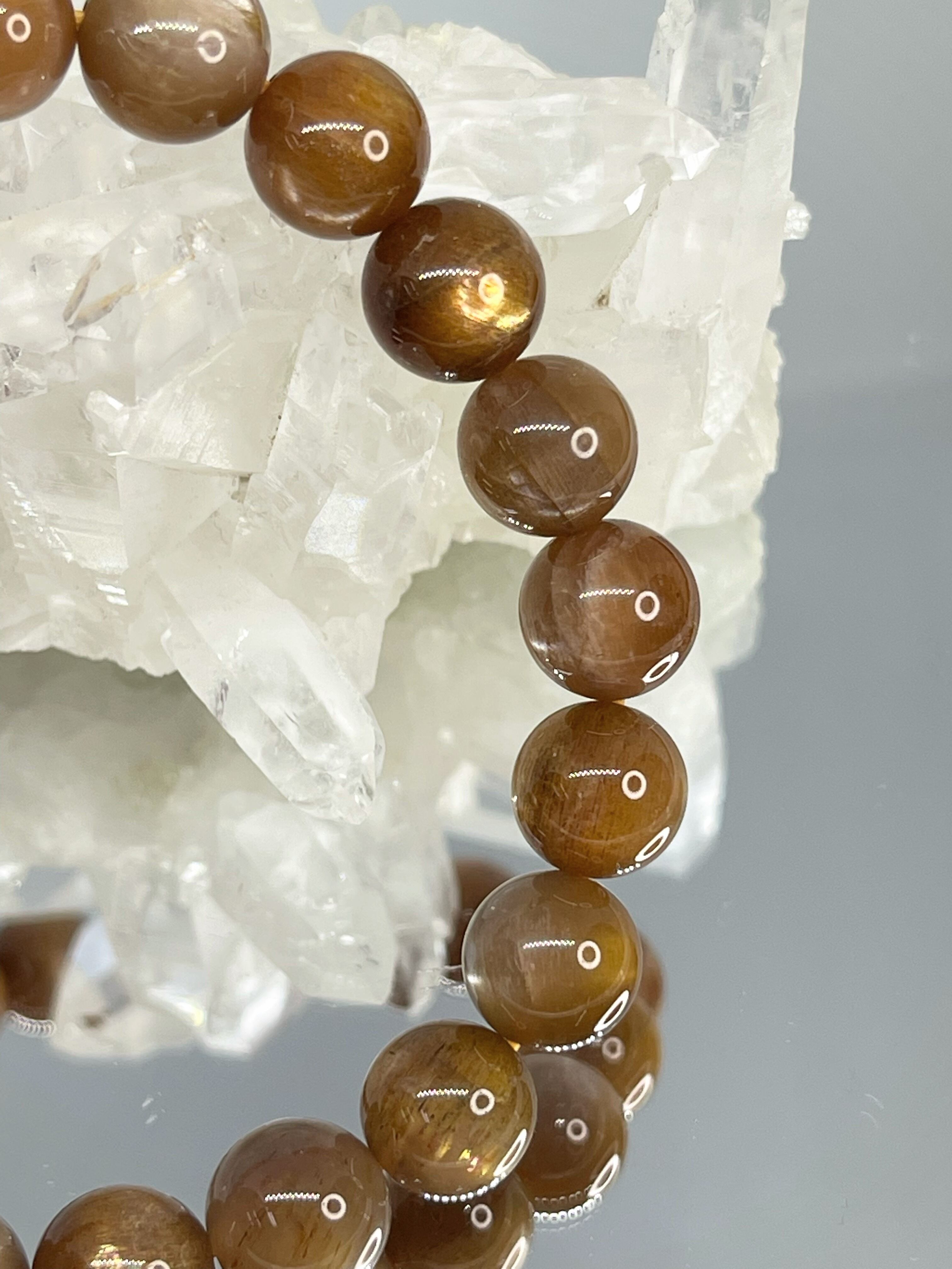 太陽の石「サンストーン」と月の石「ムーンストーン」が融合したような鉱物です。サンストーンのぎらっとした虹色のアべンチュレッセンスと、ムーンストーンのシラー効果がどちらも出ている珍しいパワーストーンですよ。