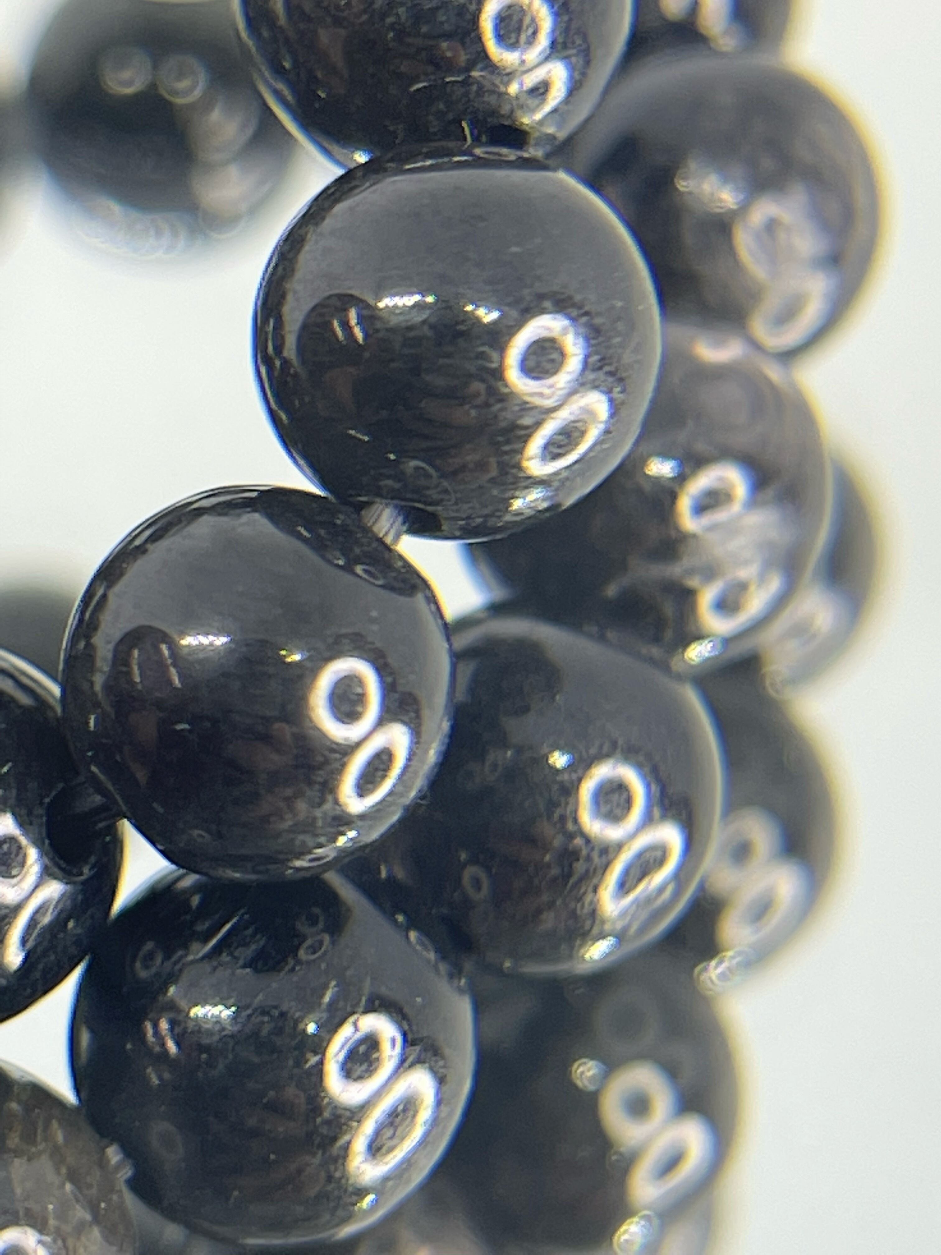 ブロンザイトと同じパイロキシンに属し、ほぼ同じ化学組成を持つ石です。鉄分が10%〜30%でブロンザイト、それ以上になるとハイパーシーンになります。メタリックなブラックの中にスター効果が見られる美しい天然石です。