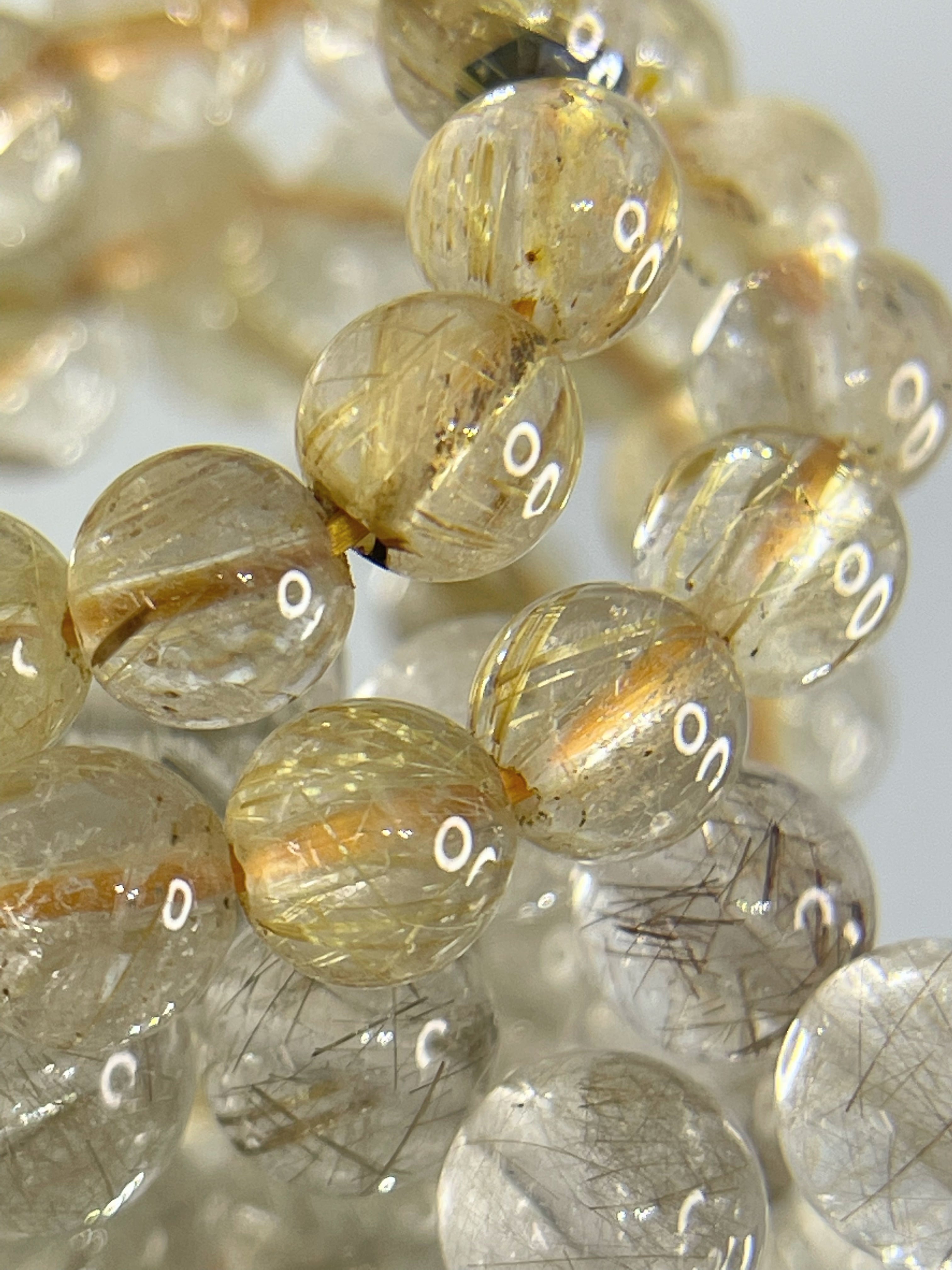 水晶の中にルチル(金紅石)を内包した天然石です。針状、または繊維状に内包され独特の輝きを放つのが特徴で、全体が黄金色になるものは特に人気があります。「金の線が入る」=「金銭が入る」ともいわれており、金運アップにもっとも力を発揮すると信じられています。