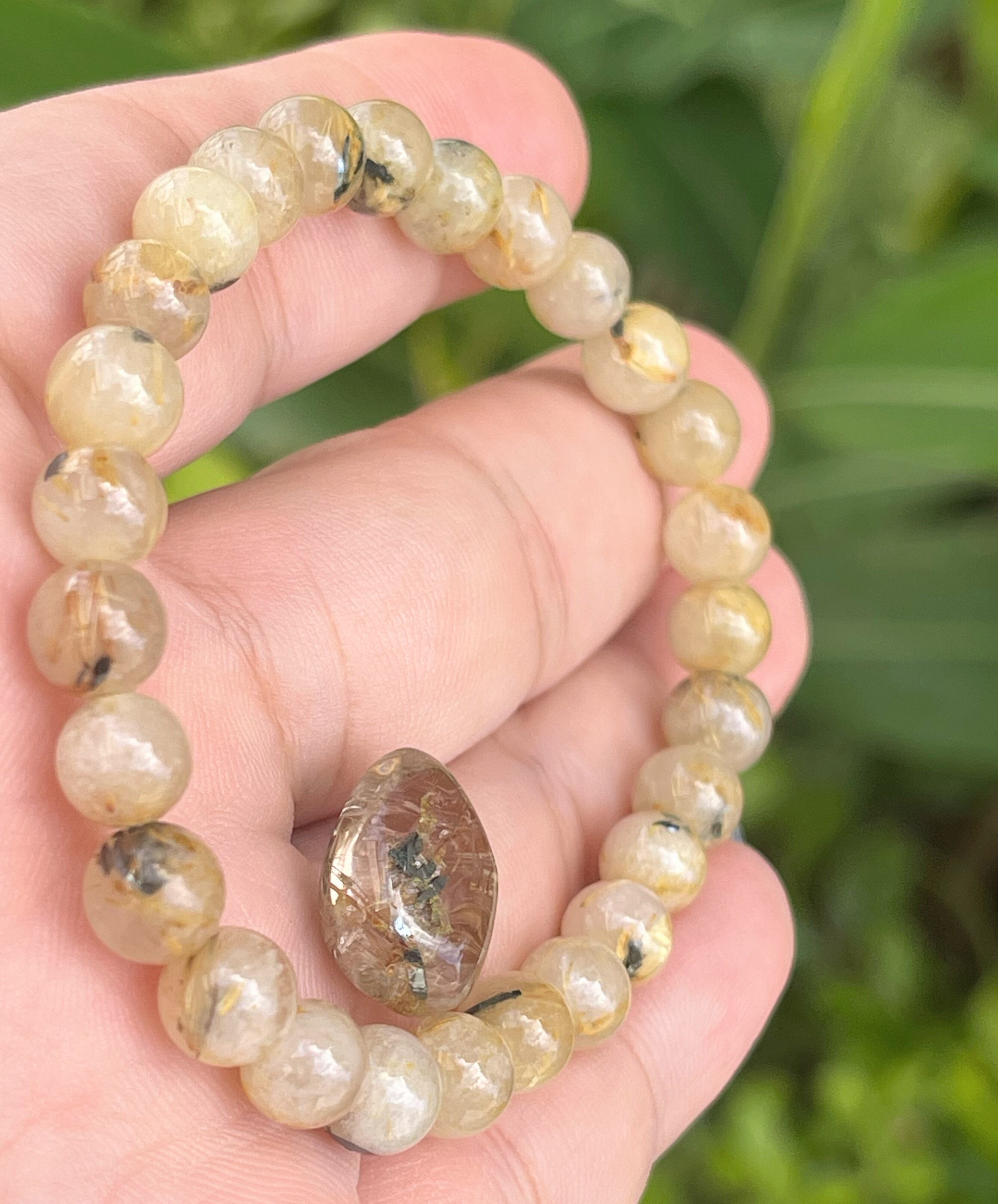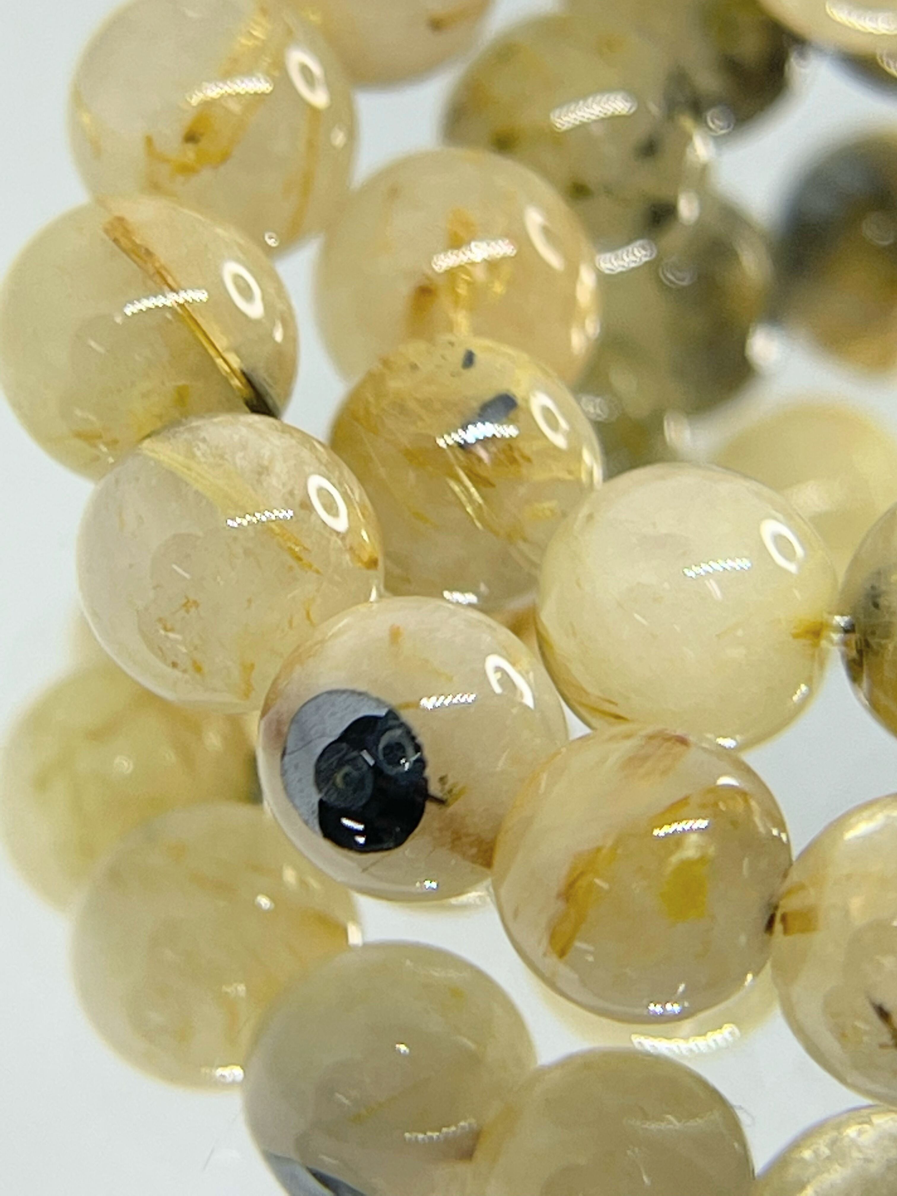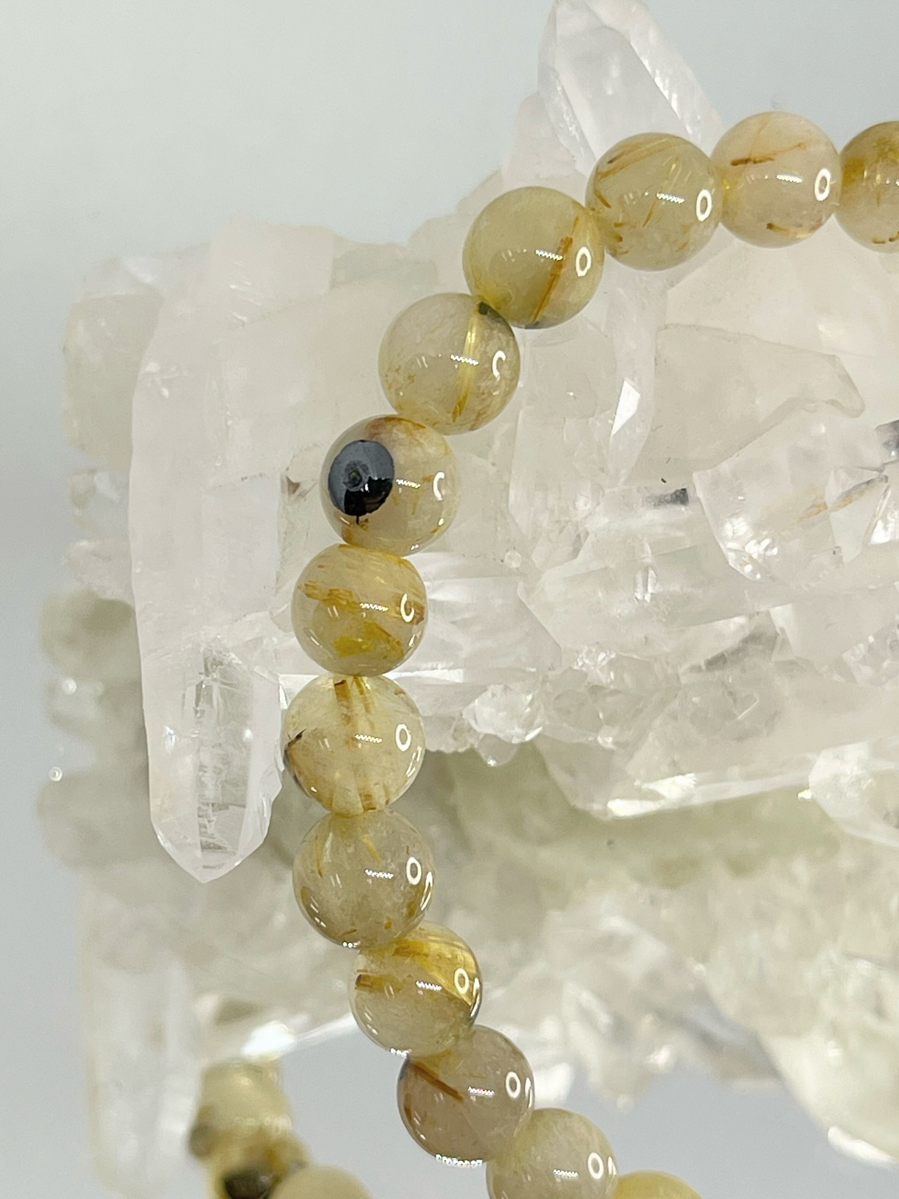 水晶の中にルチル(金紅石)を内包した天然石です。針状、または繊維状に内包され独特の輝きを放つのが特徴で、全体が黄金色になるものは特に人気があります。「金の線が入る」=「金銭が入る」ともいわれており、金運アップにもっとも力を発揮すると信じられています。