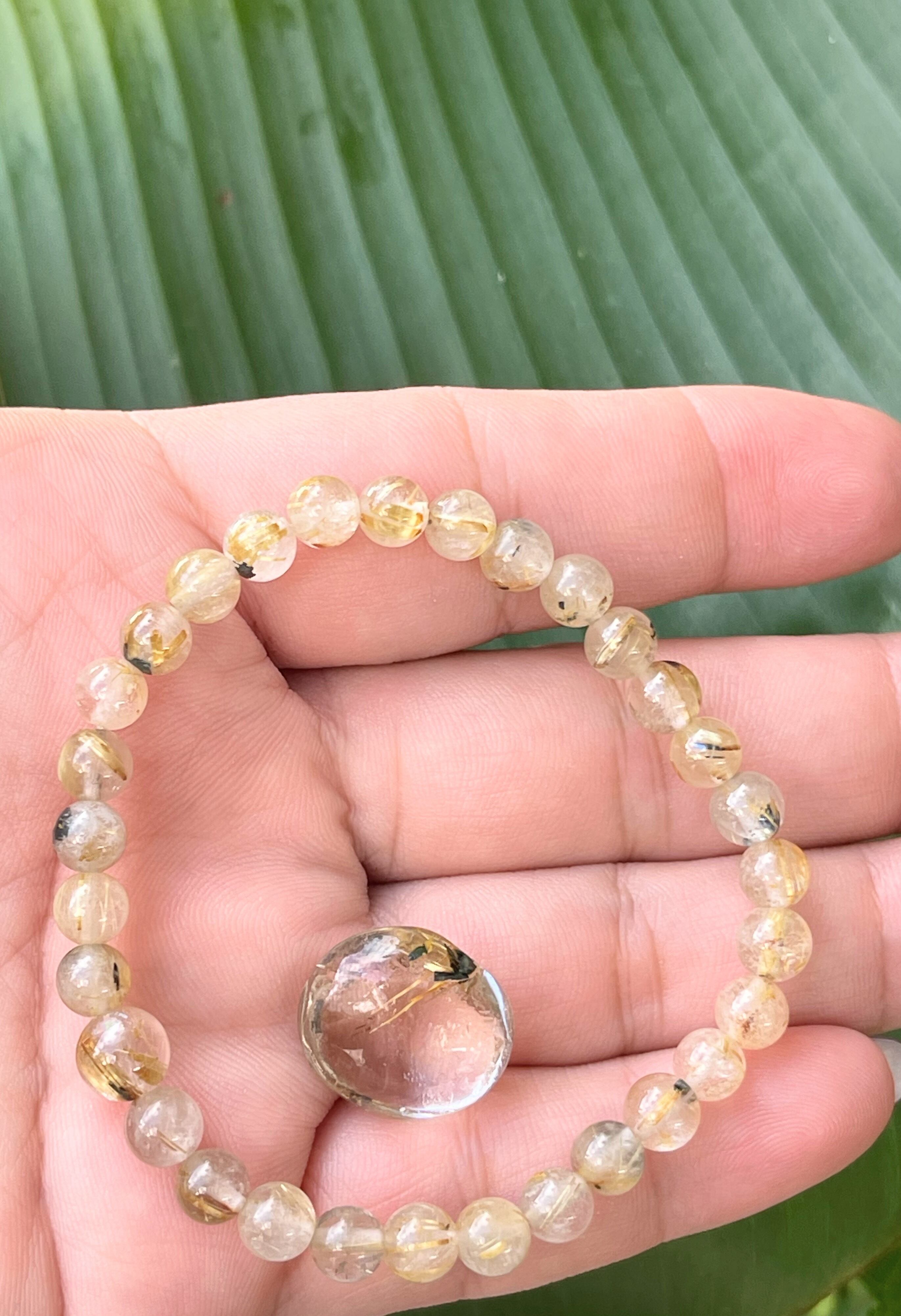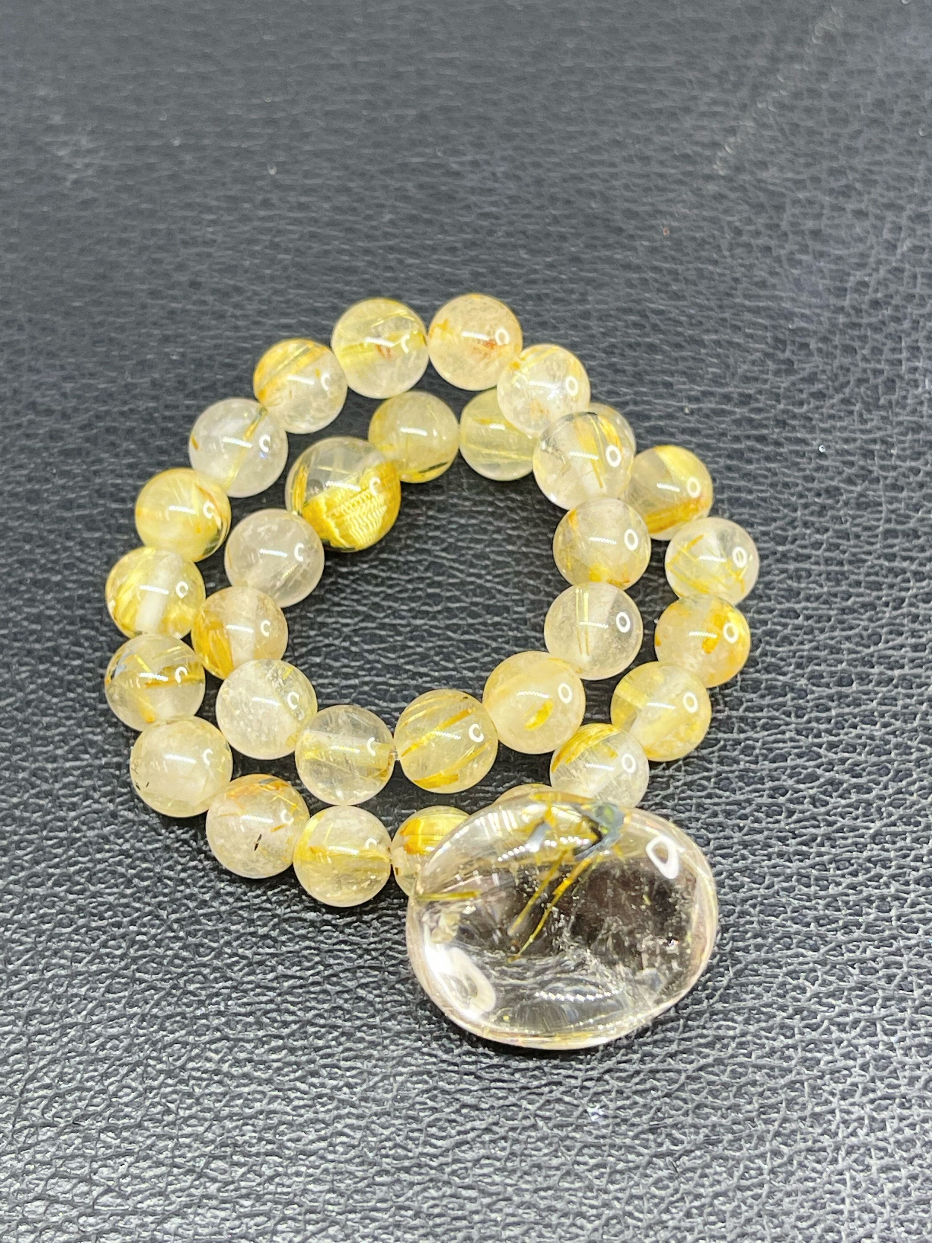 水晶の中にルチル(金紅石)を内包した天然石です。針状、または繊維状に内包され独特の輝きを放つのが特徴で、全体が黄金色になるものは特に人気があります。「金の線が入る」=「金銭が入る」ともいわれており、金運アップにもっとも力を発揮すると信じられています。