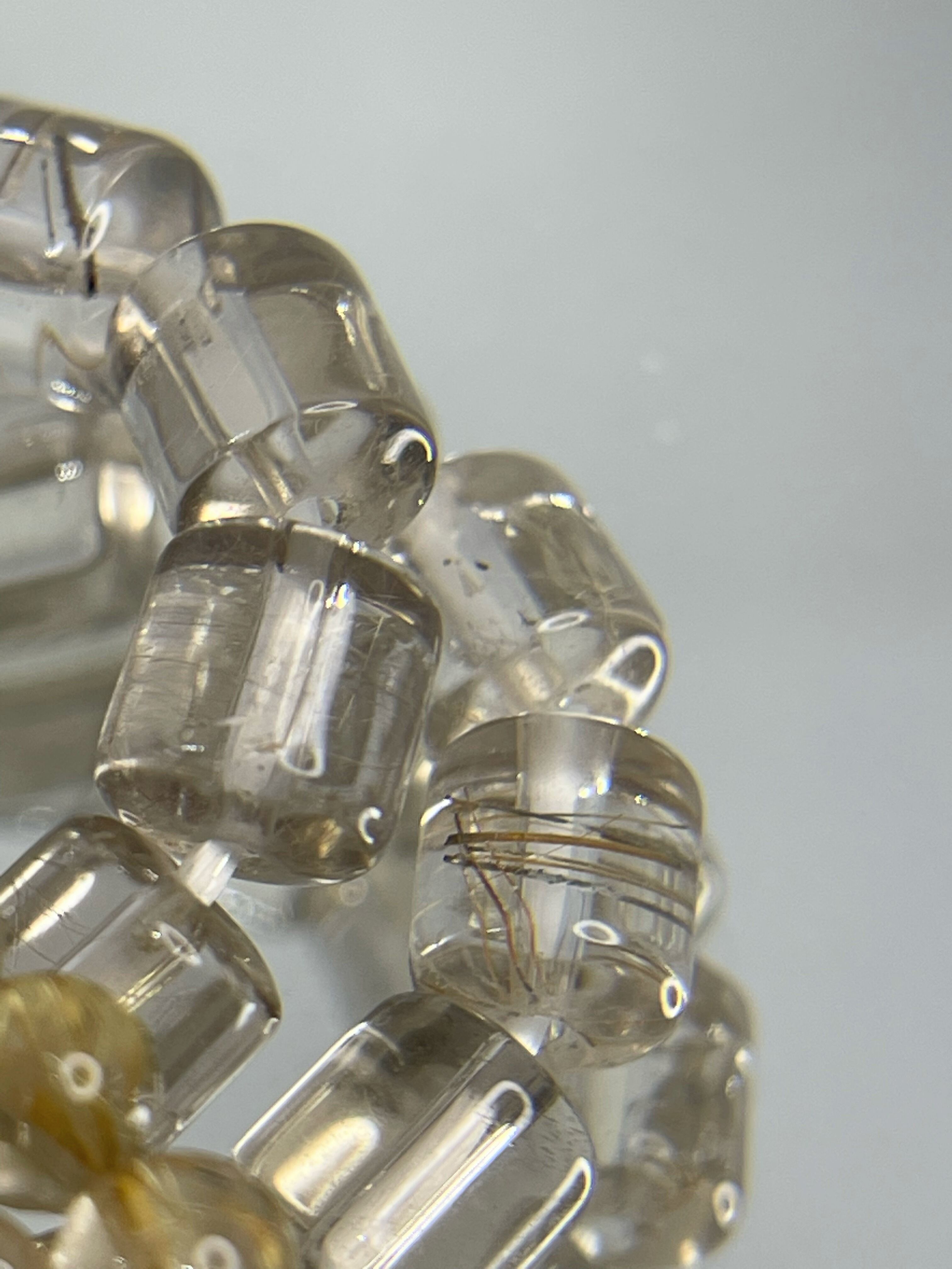水晶の中にルチル(金紅石)を内包した天然石です。針状、または繊維状に内包され独特の輝きを放つのが特徴で、全体が黄金色になるものは特に人気があります。「金の線が入る」=「金銭が入る」ともいわれており、金運アップにもっとも力を発揮すると信じられています。