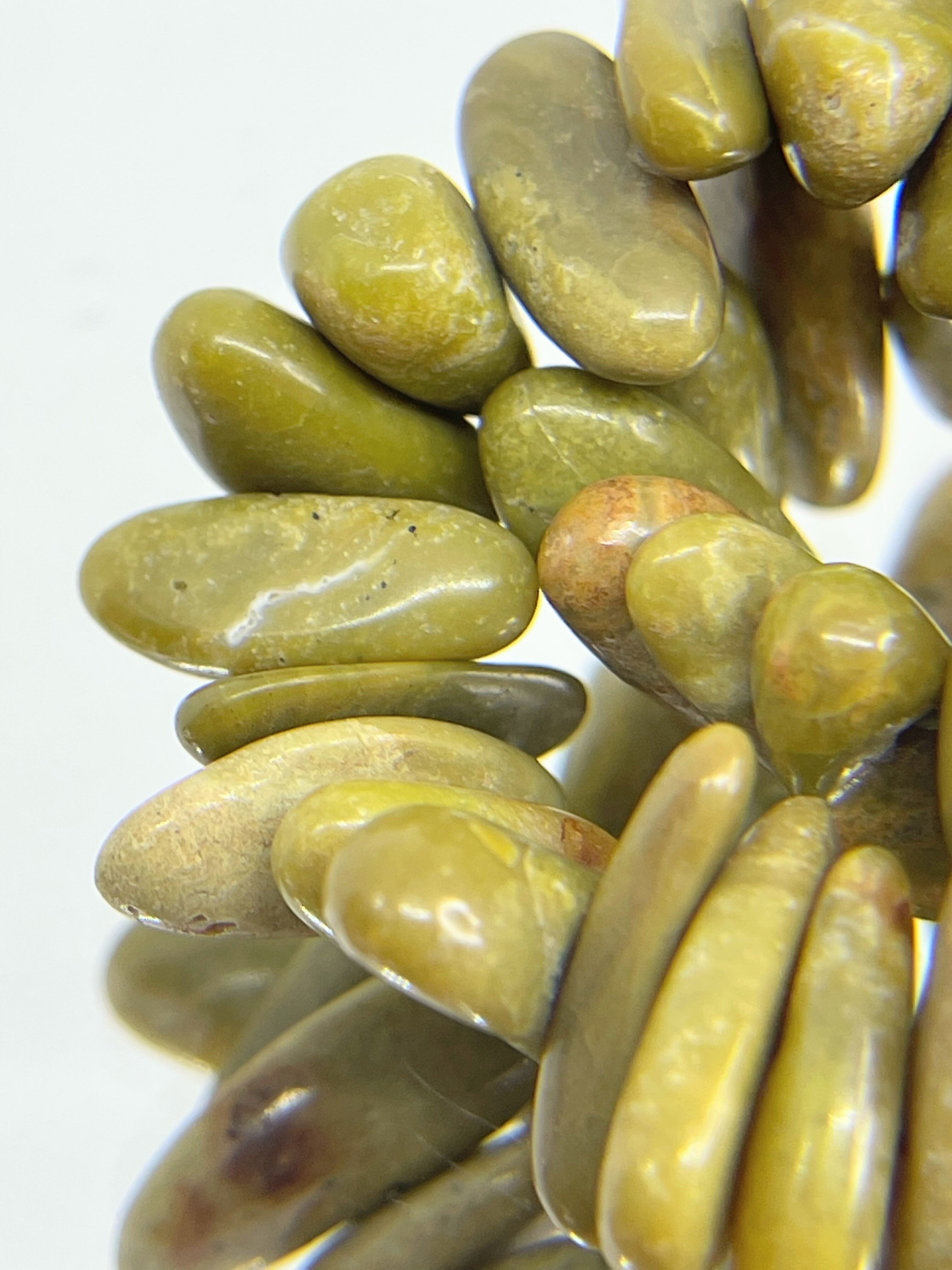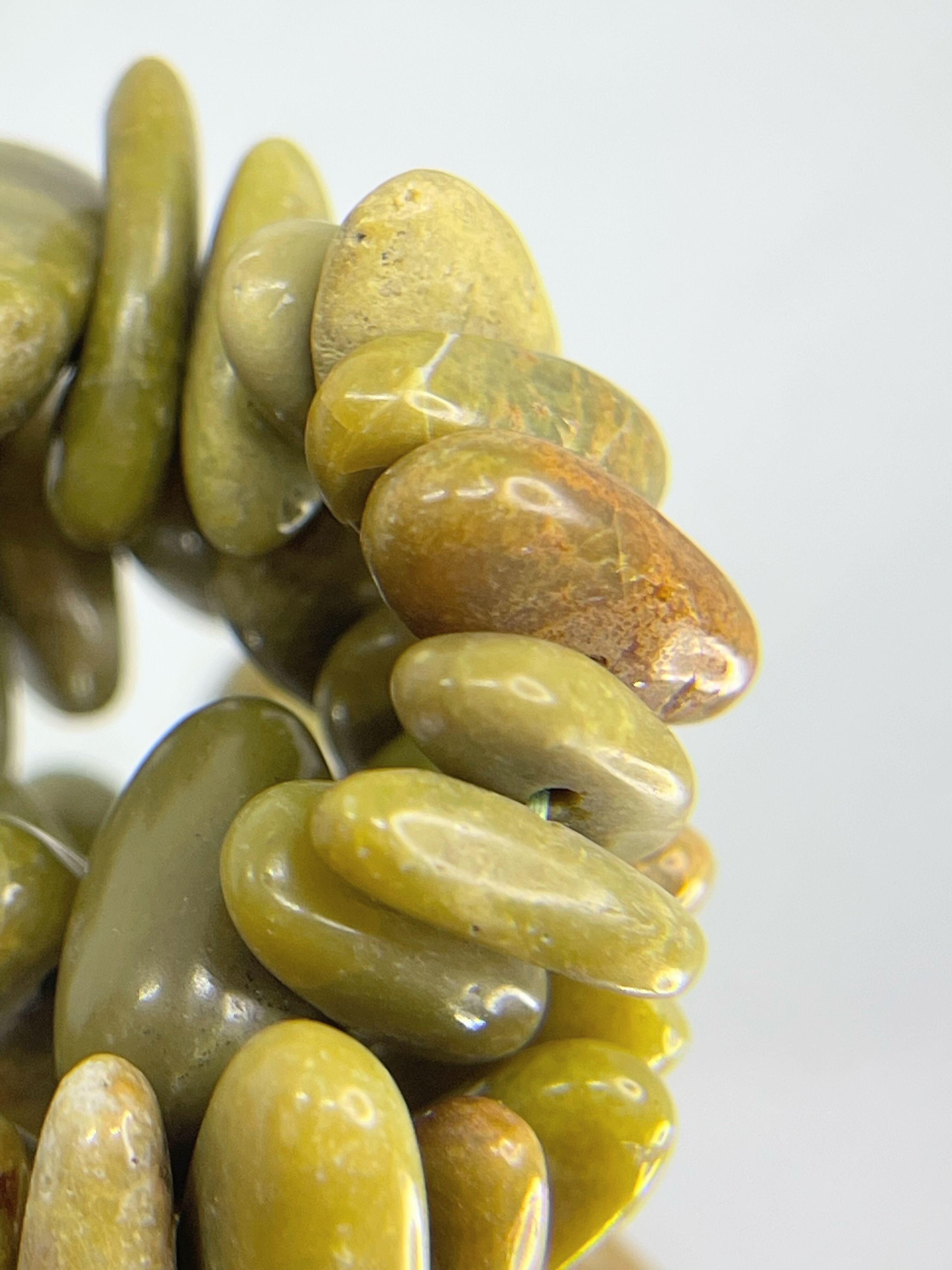 緑泥石(クローライト)緑簾石(エピドート)石英(クォーツ)長石(フェルドスパー)などの混合石です。大半を占める緑色の成分は、エピドートには強力なリラックス作用があるとされてます。ピンクのフェルドスパーは、エネルギーを全身にわたらせる。