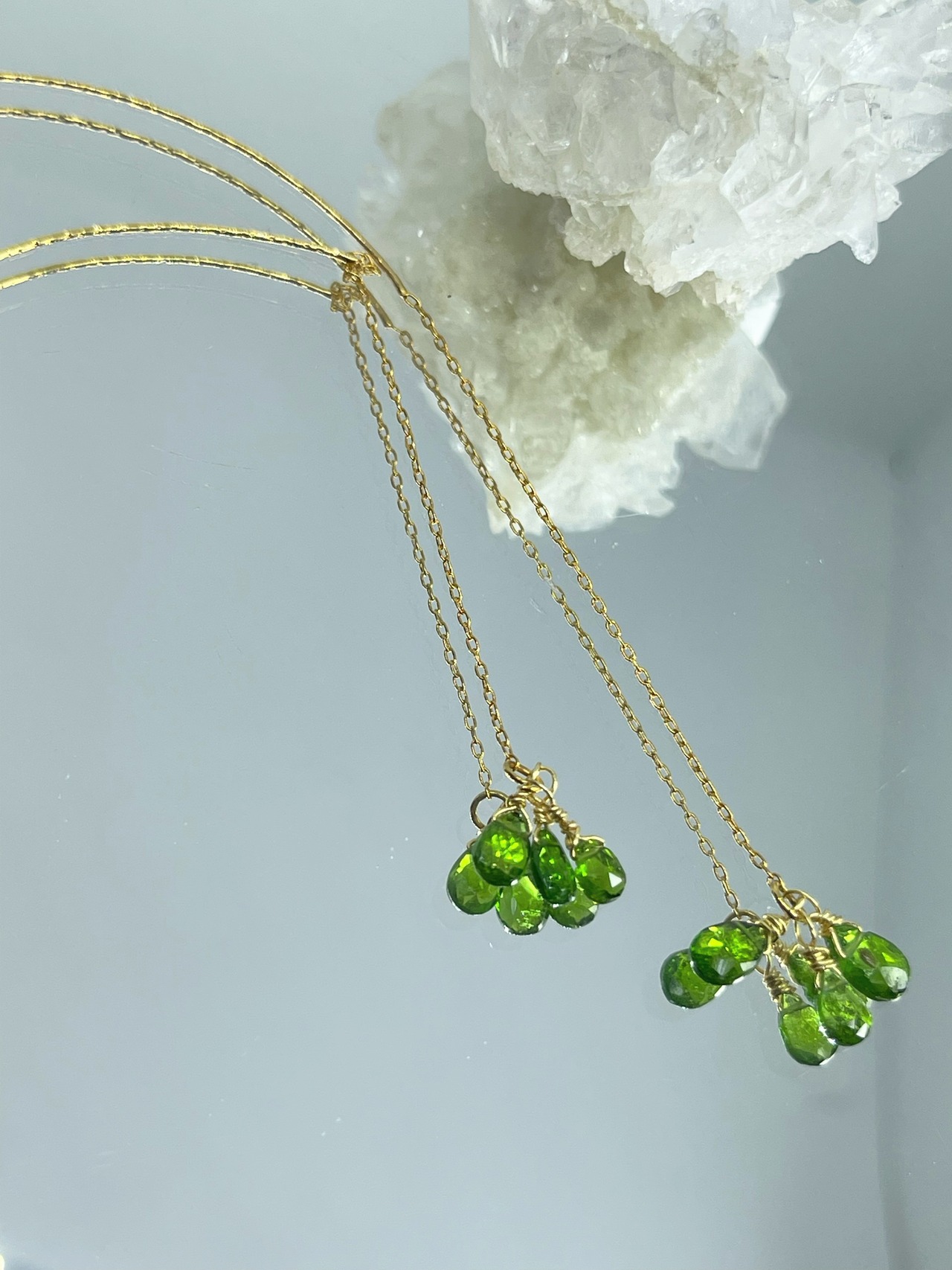 白、灰、黒などの色をもつダイオプサイトの中で、クロムを発色要因とし、深く鮮やかな緑色のものをクロムダイオプサイトと呼びます。エメラルドに似た深緑がとても美しい輝きが特徴で、別名で「ロシアのエメラルド」と呼ばれています。グリーンカラーは特に浄化力が強い