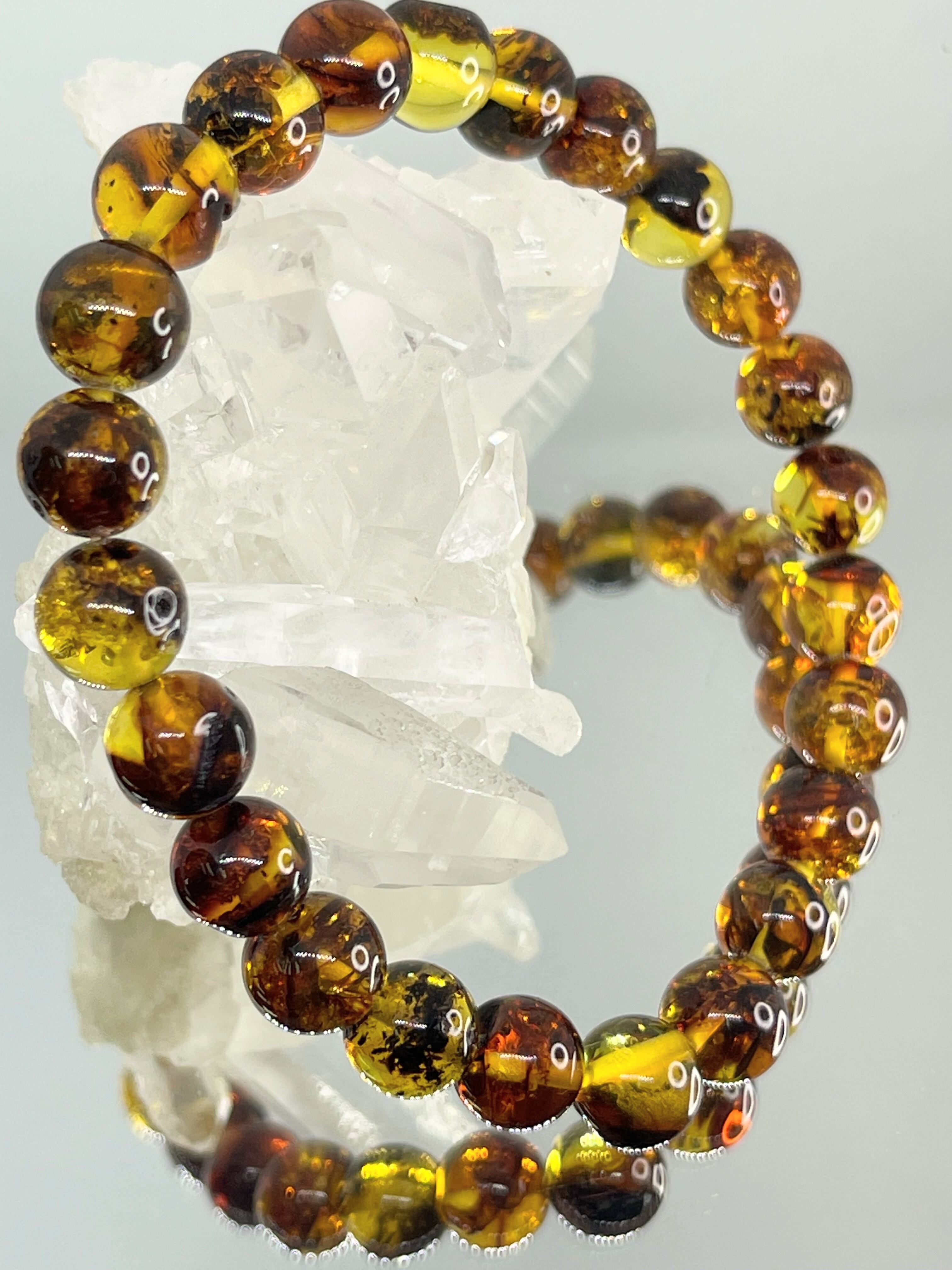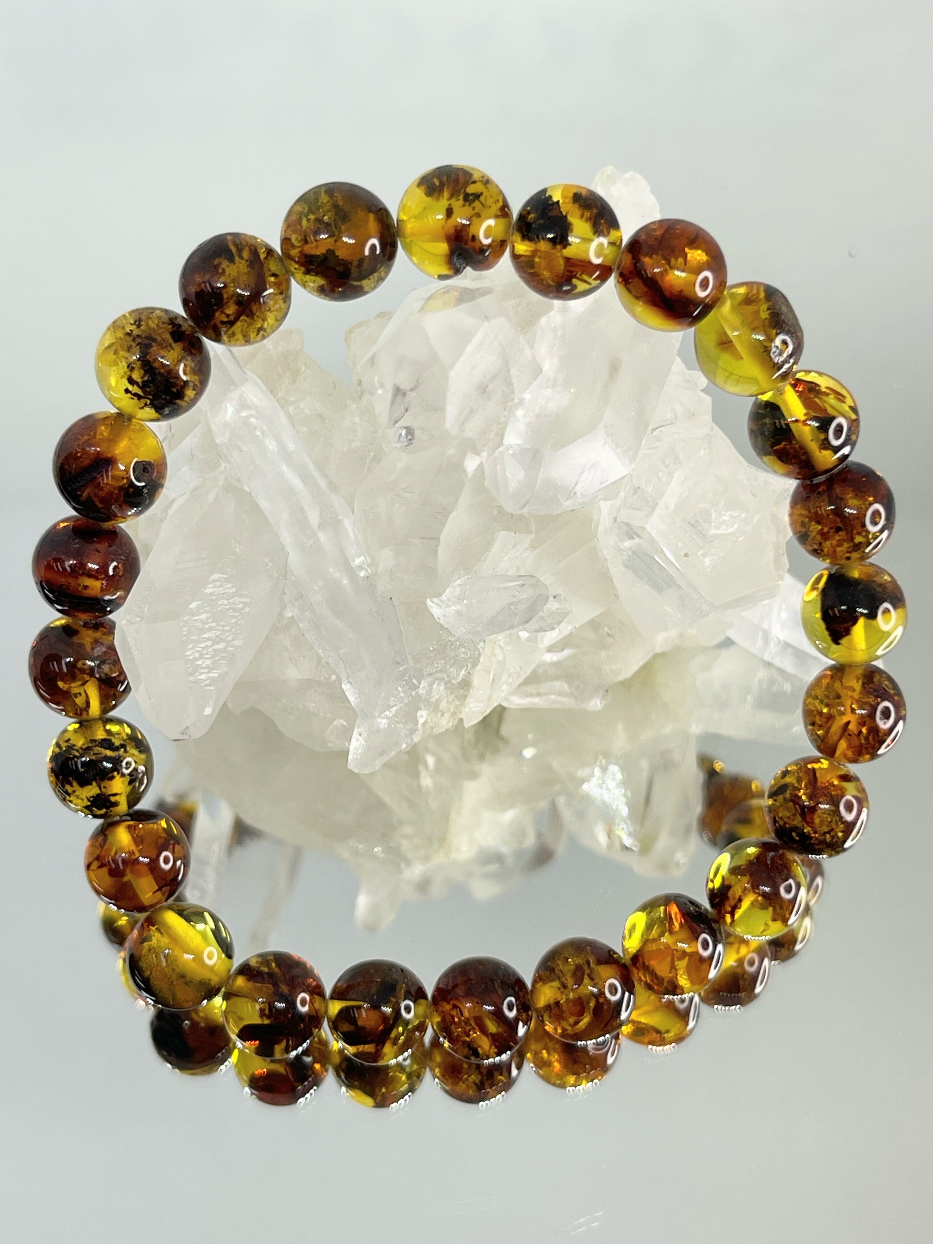半透明でミツバチの蜜蝋に似ている事から、ハニーアンバー(蜜蝋琥珀)と呼ばれるようになったと言われています。 古くから富と健康の宝石として親しまれ、今もヒーリングストーンとして人気絶大です。樹脂の化石と言われるアンバーは、約3000まん年前の松の木が分泌した樹液(樹脂)で、特定の成分が長い時間をかけて固まり硬化したものです。