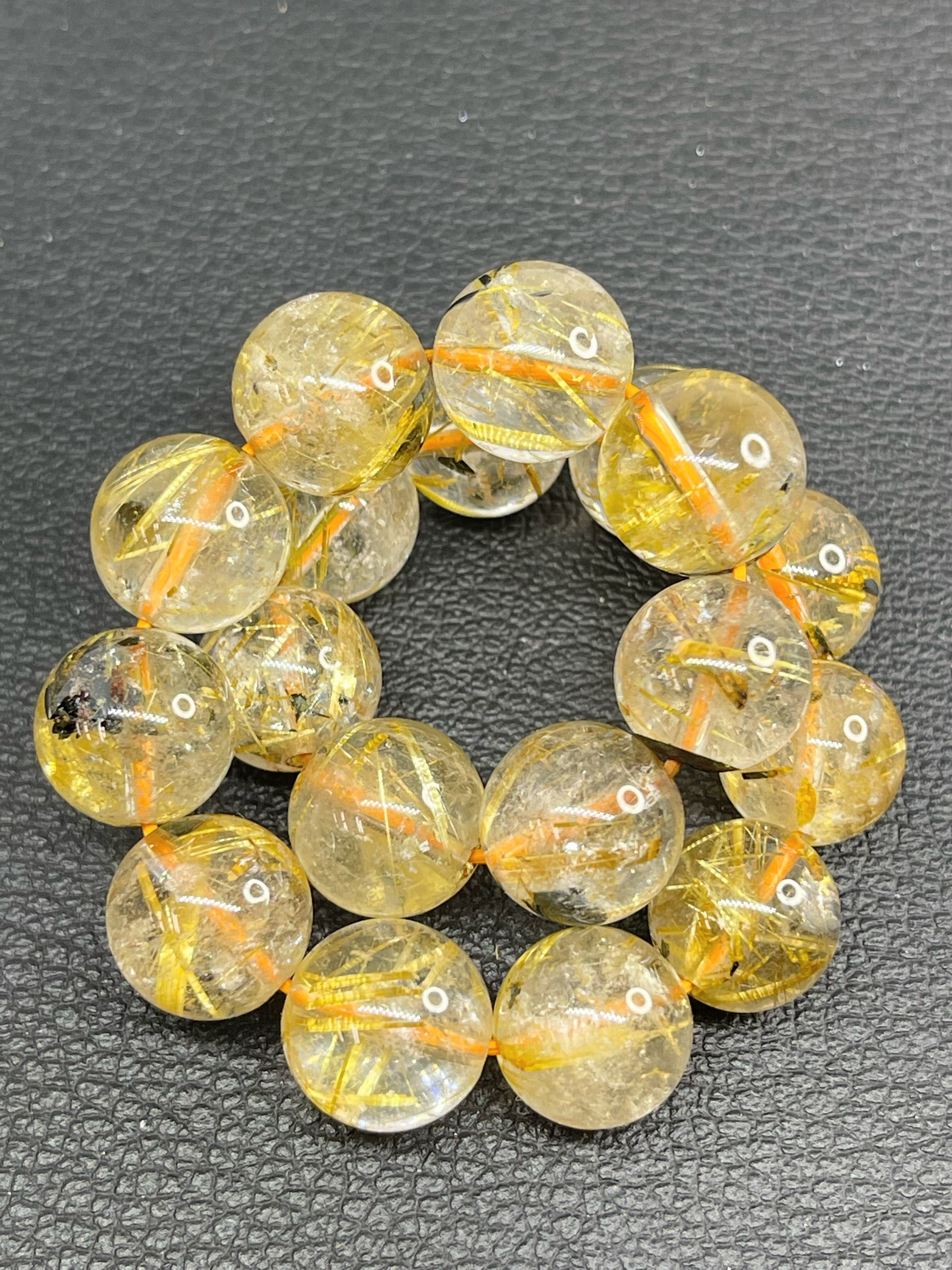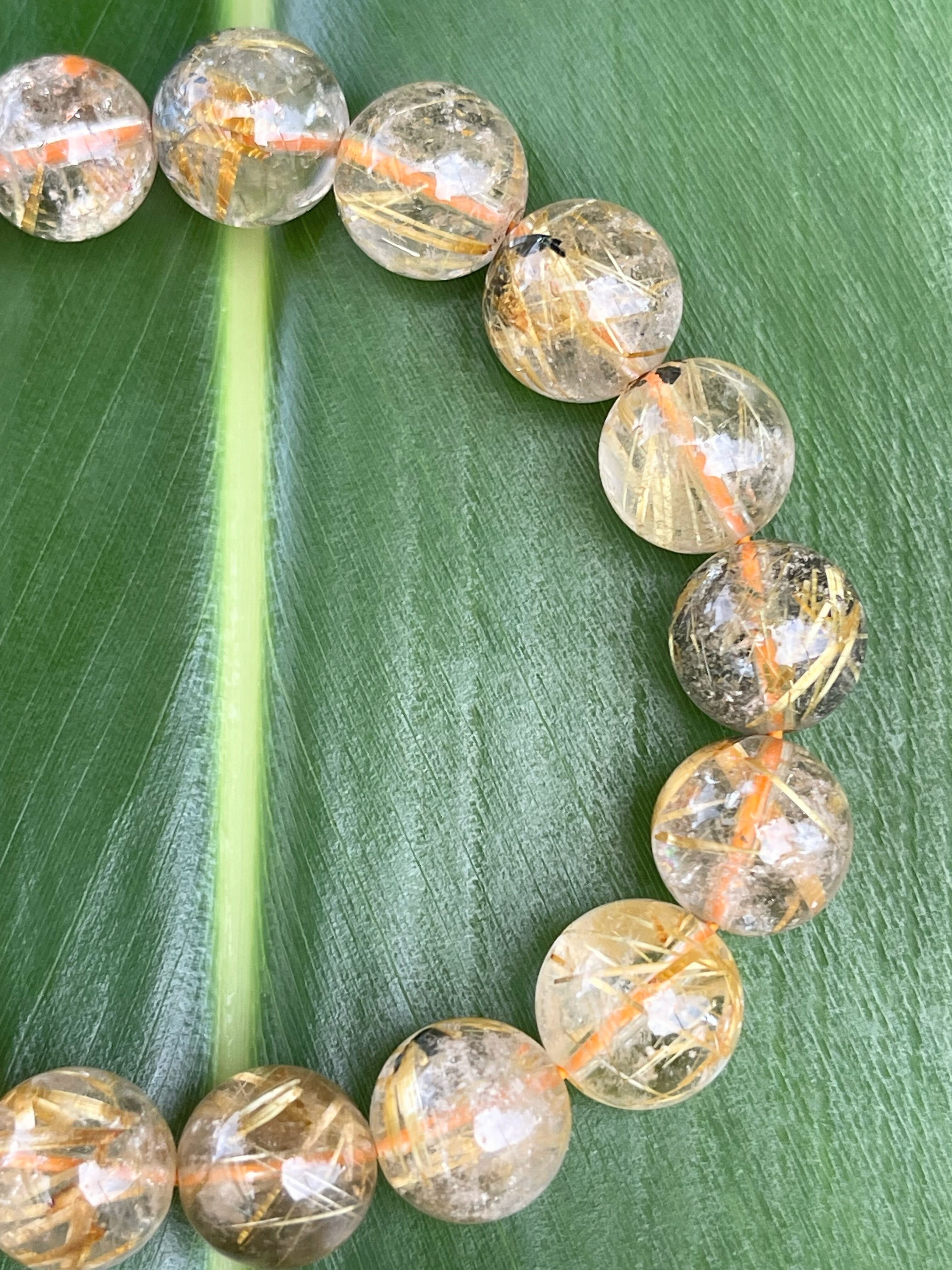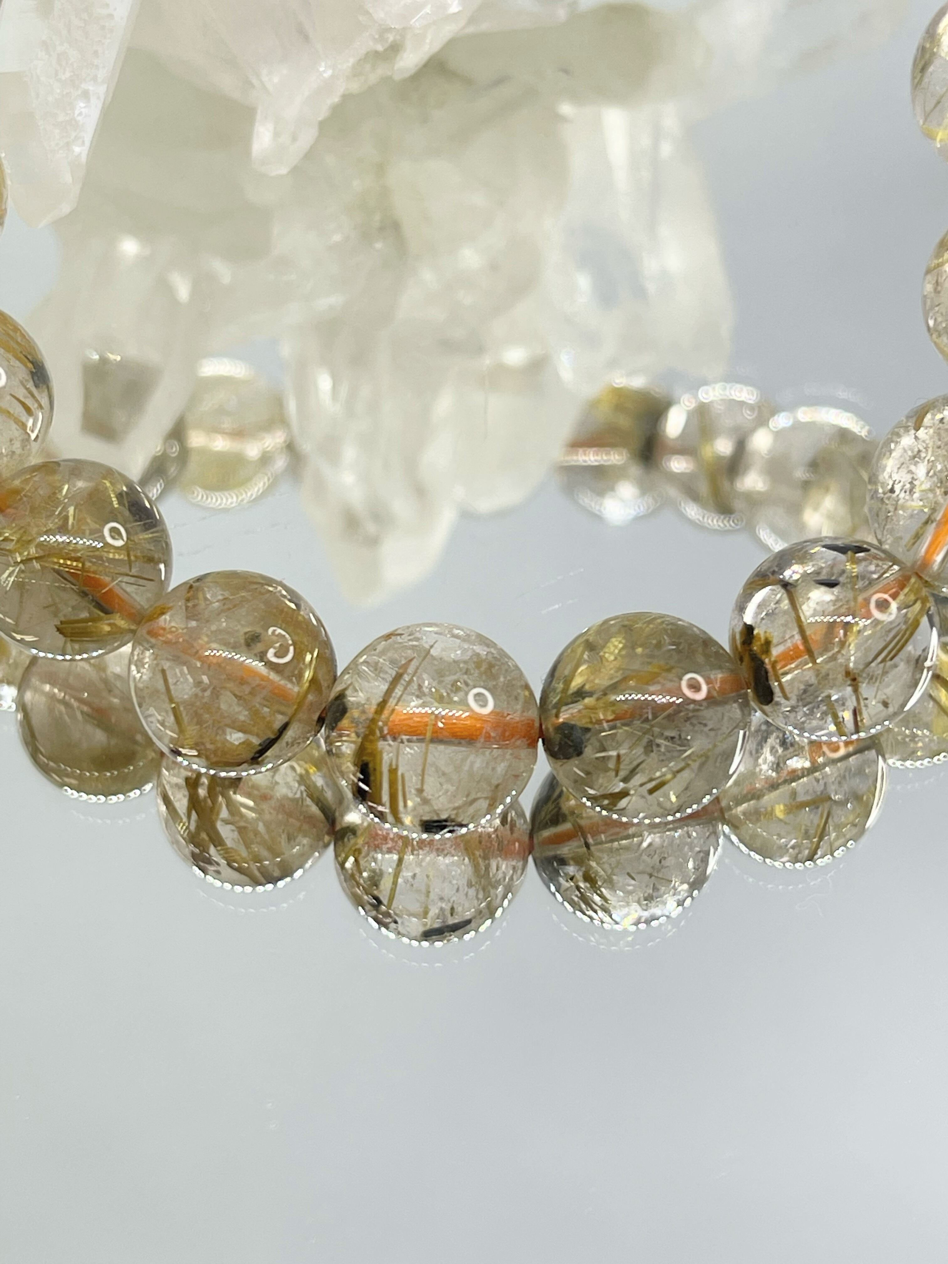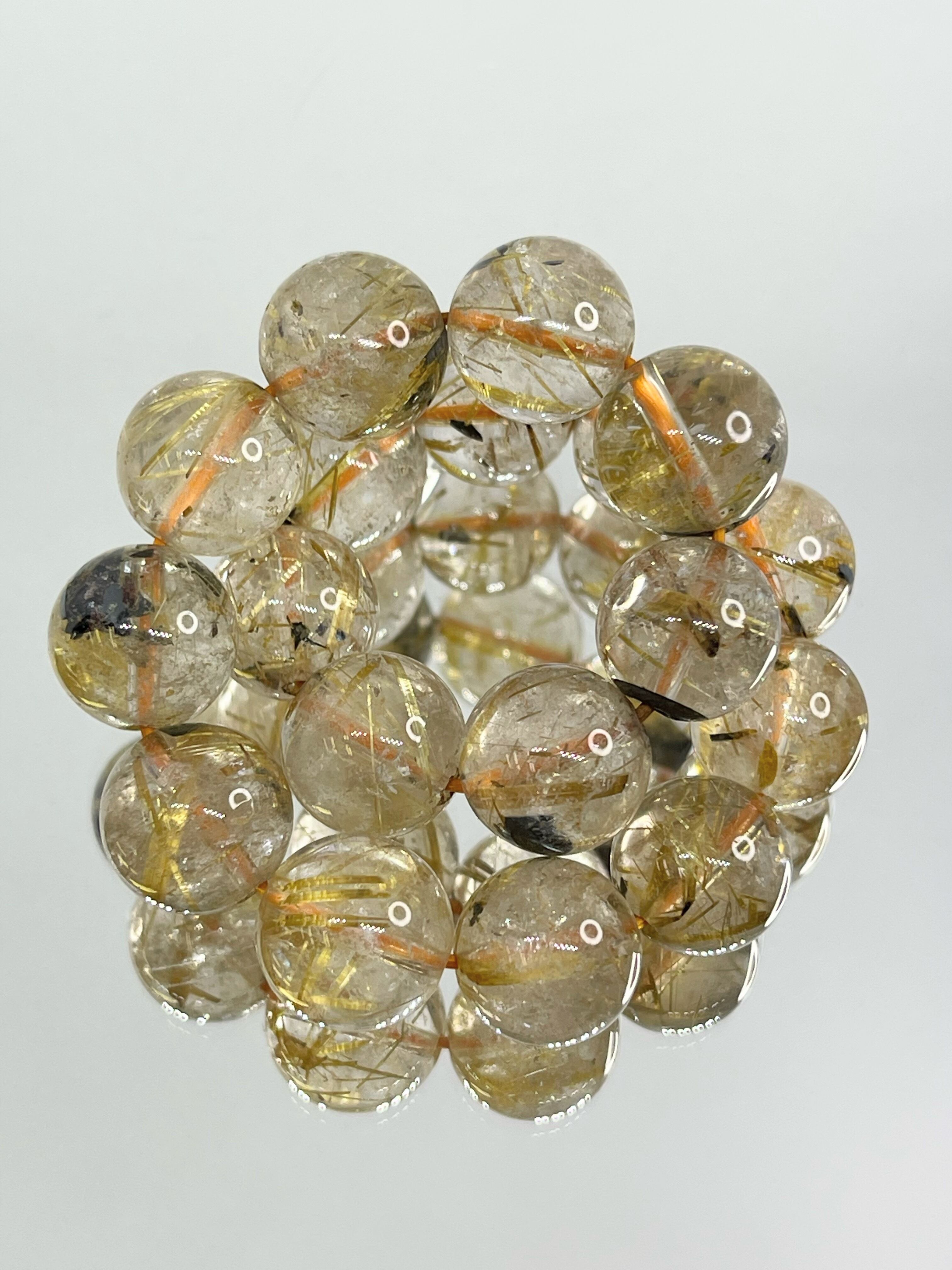 水晶の中にルチル(金紅石)を内包した天然石です。針状、または繊維状に内包され独特の輝きを放つのが特徴で、全体が黄金色になるものは特に人気があります。「金の線が入る」=「金銭が入る」ともいわれており、金運アップにもっとも力を発揮すると信じられています。
