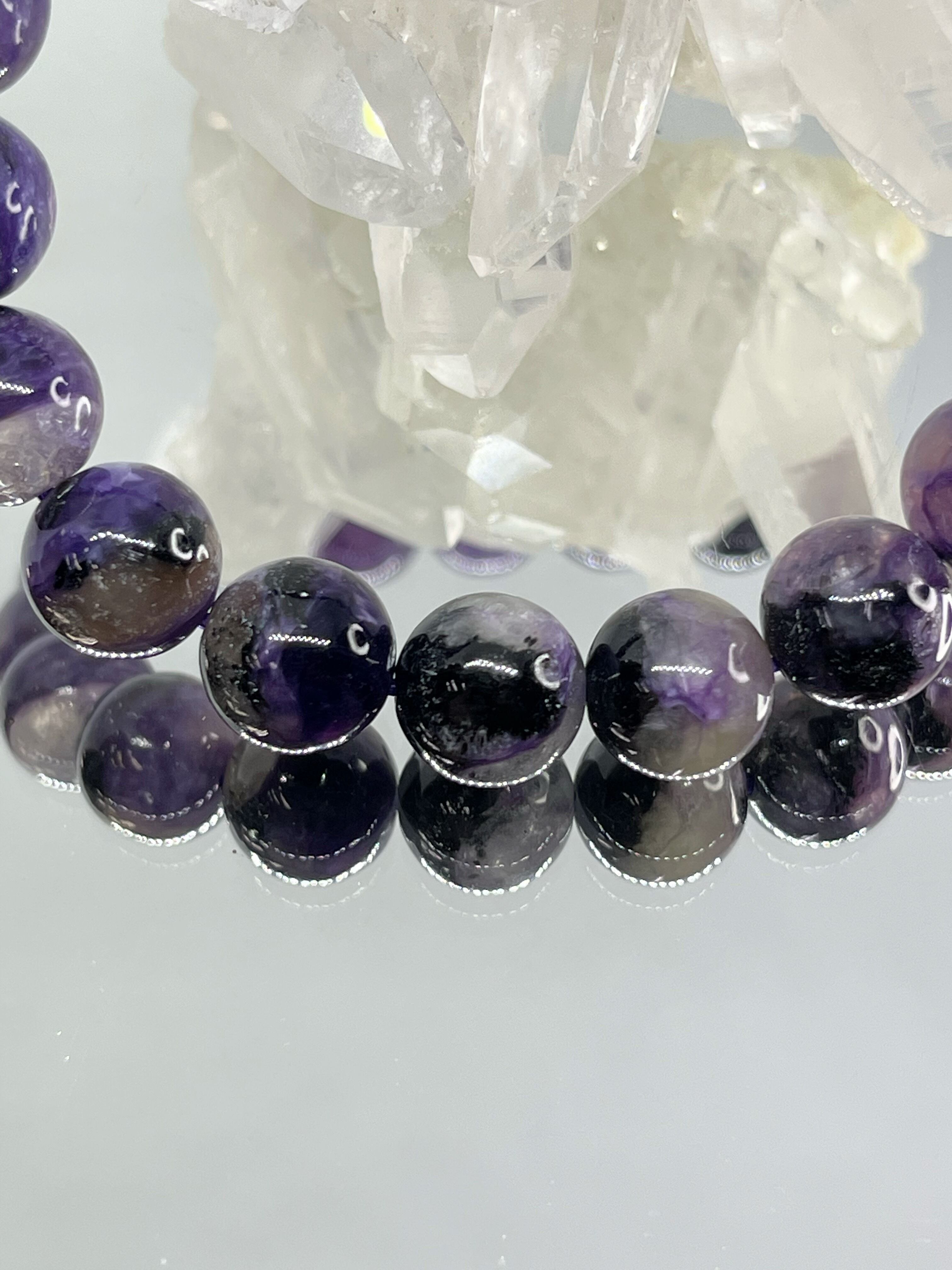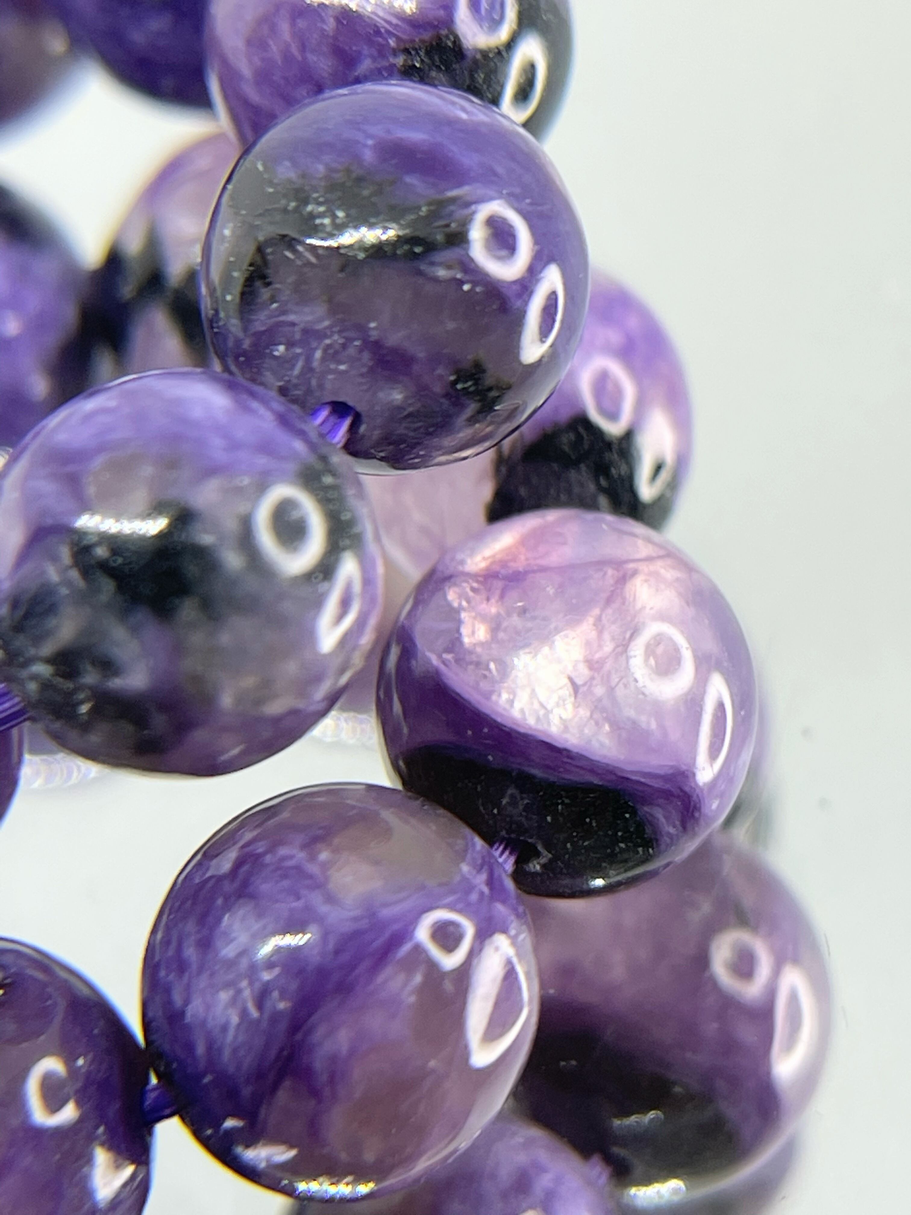 チャロアイトはキレイな濃い紫色が主ですが「白・黒・茶色」がマーブル状になっているのが特徴です。スギライト、ラリマーもとに世界3大ヒーリングストーンです。ロシア語の「チャロ=魅惑」からついたという説もあります。