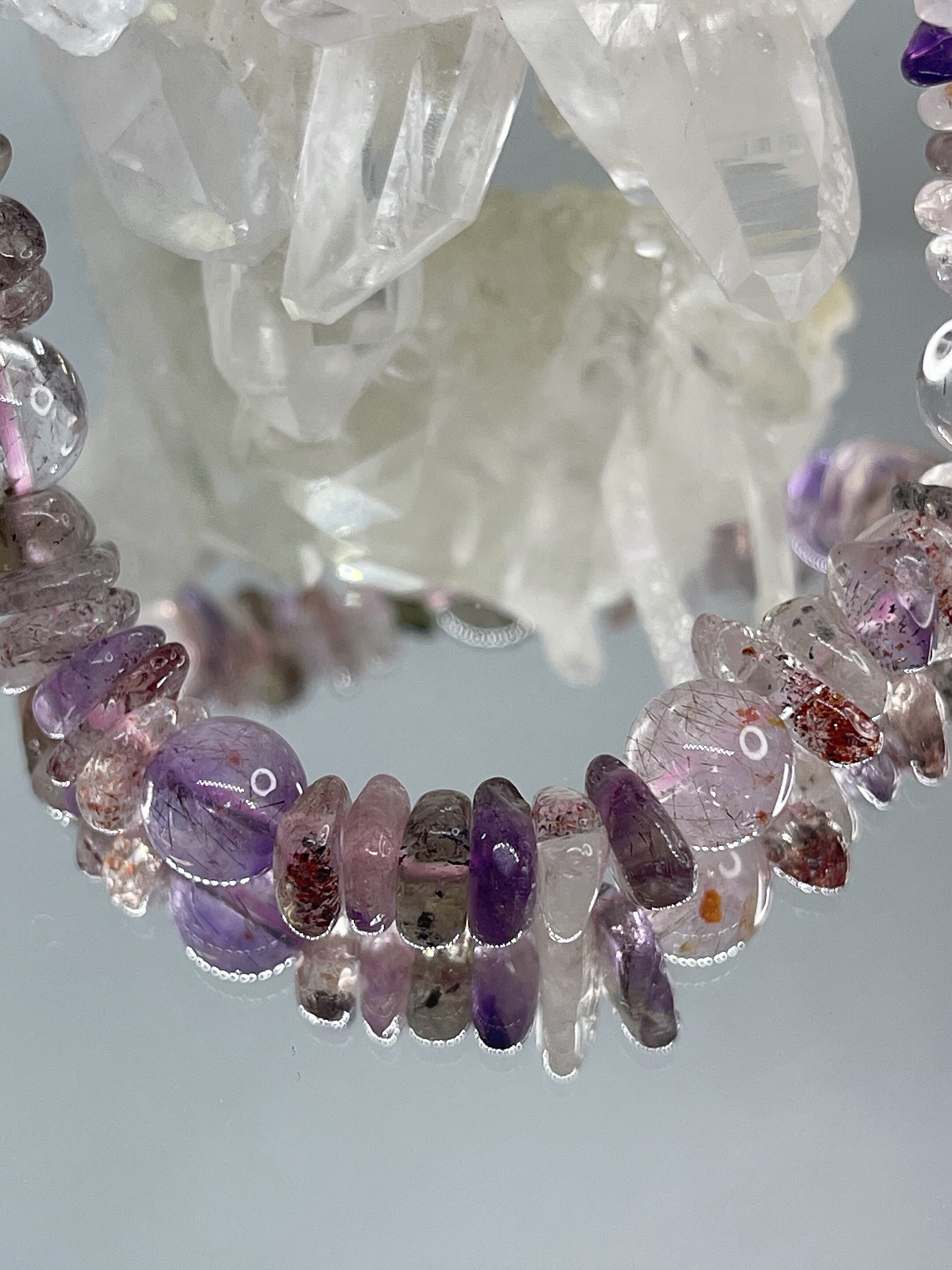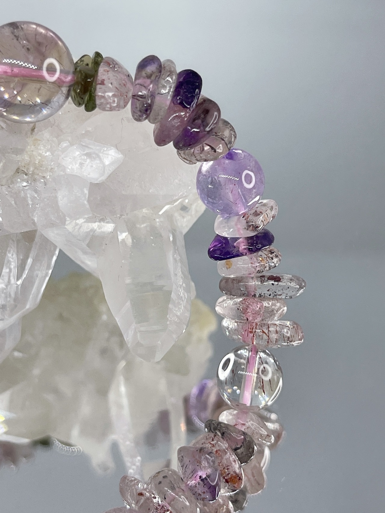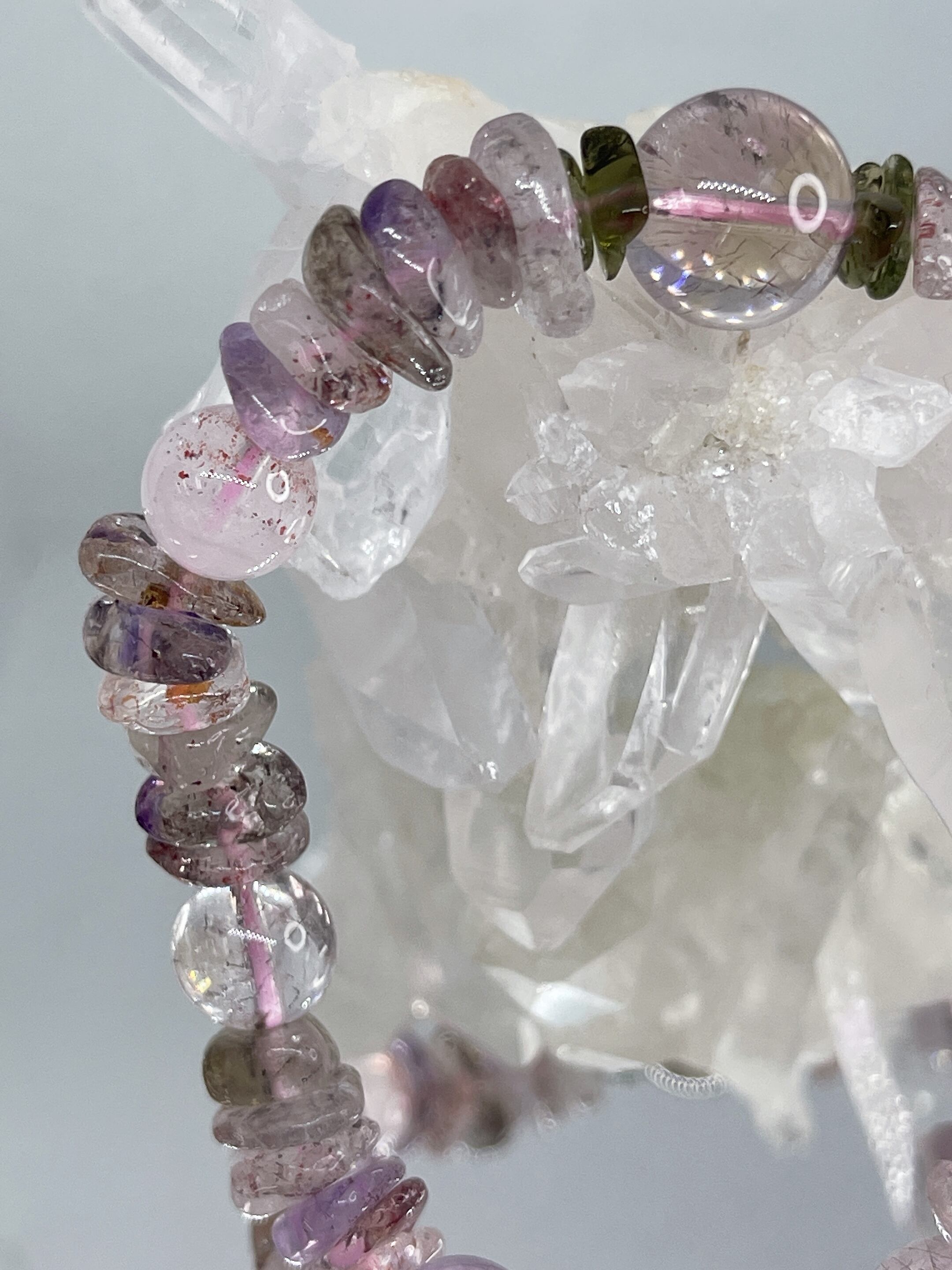 クリスタル、アメジスト、カコクセナイト、ゲーサイト、レピドクロサイト、スモーキークォーツ、ルチルの7種類です。加工後に鉱物が入っていなくても、原石に全て含まれていたなら同等の力を持って持つと言われています。持つ人を選びません。