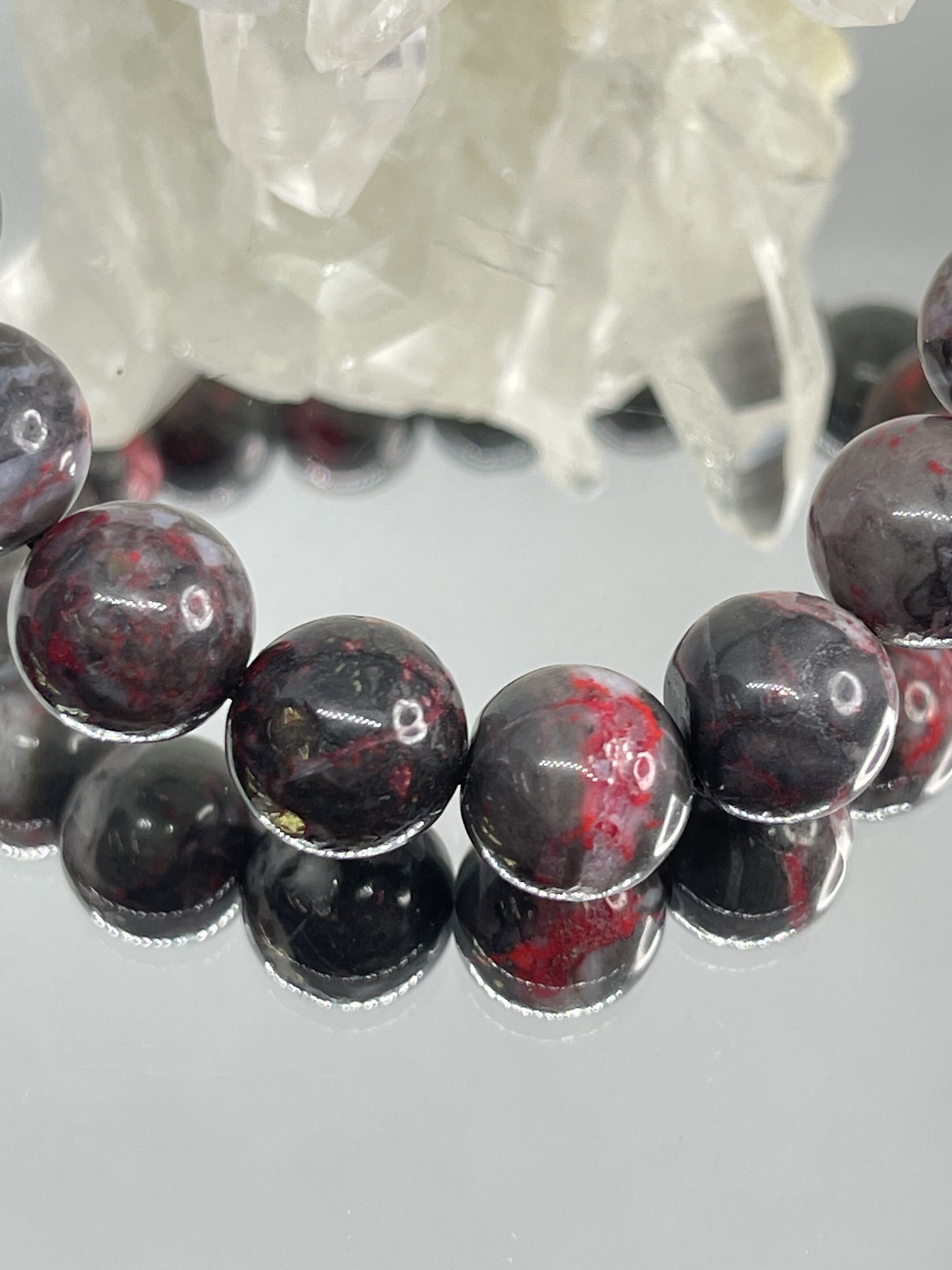 主成分は水銀で、古代の錬金術師たちは黄金を産み出す「賢者の石」と呼ばれていました。※水銀は常温では毒性はありません。血液を連想させるような真っ赤な色をしているため「ドラゴンブラッド」とも呼ばれています。独特な見た目は好き嫌いがはっきり分かれ、それも石の魅力です。