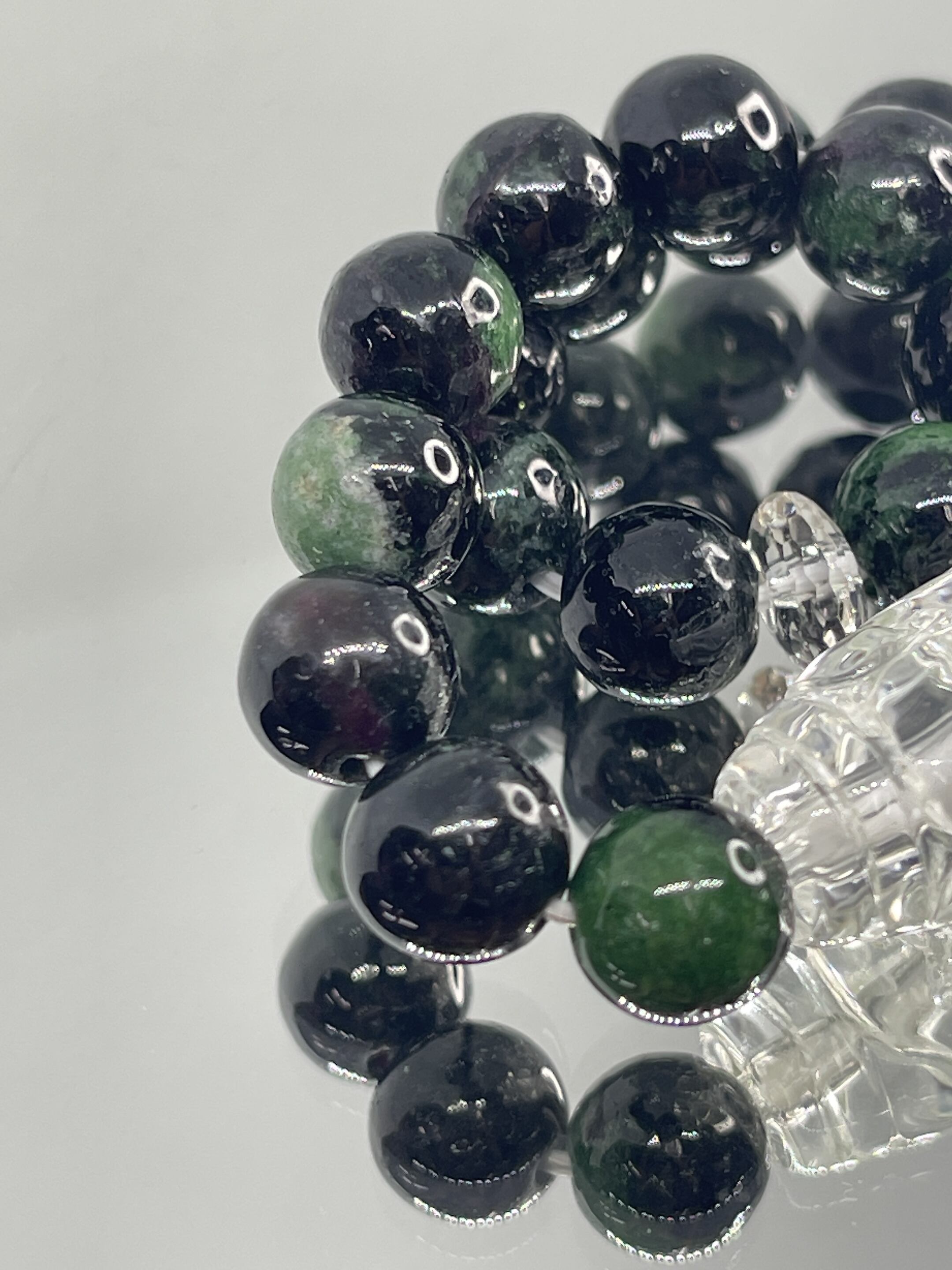 タンザニア産の緑色で不透明な石で、ゾイサイトの中にルビーを含んだパワーストーンです。 癒しのパワーで幸福感を高めるとされるゾイサイトの効果に、ルビーの生命力活性効果が加わり、心身に前向きな力をくれる石として知られています。