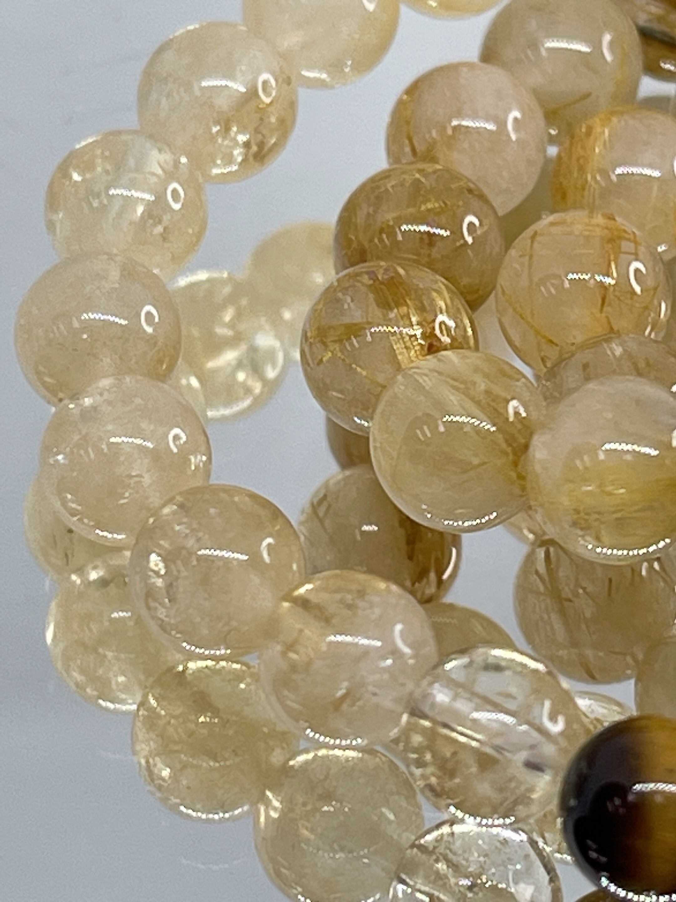 水晶の中にルチル(金紅石)を内包した天然石です。針状、または繊維状に内包され独特の輝きを放つのが特徴で、全体が黄金色になるものは特に人気があります。「金の線が入る」=「金銭が入る」ともいわれており、金運アップにもっとも力を発揮すると信じられています。