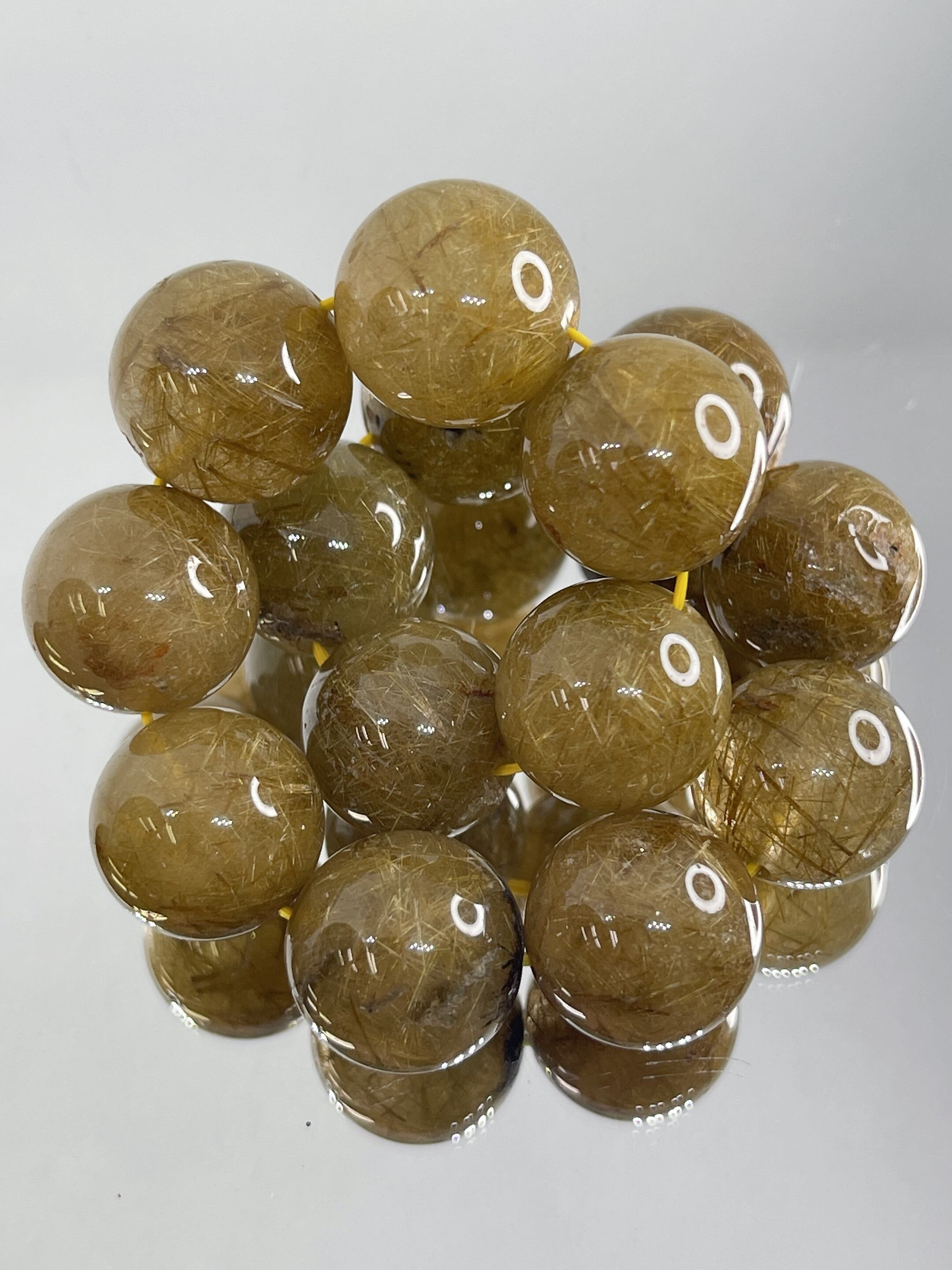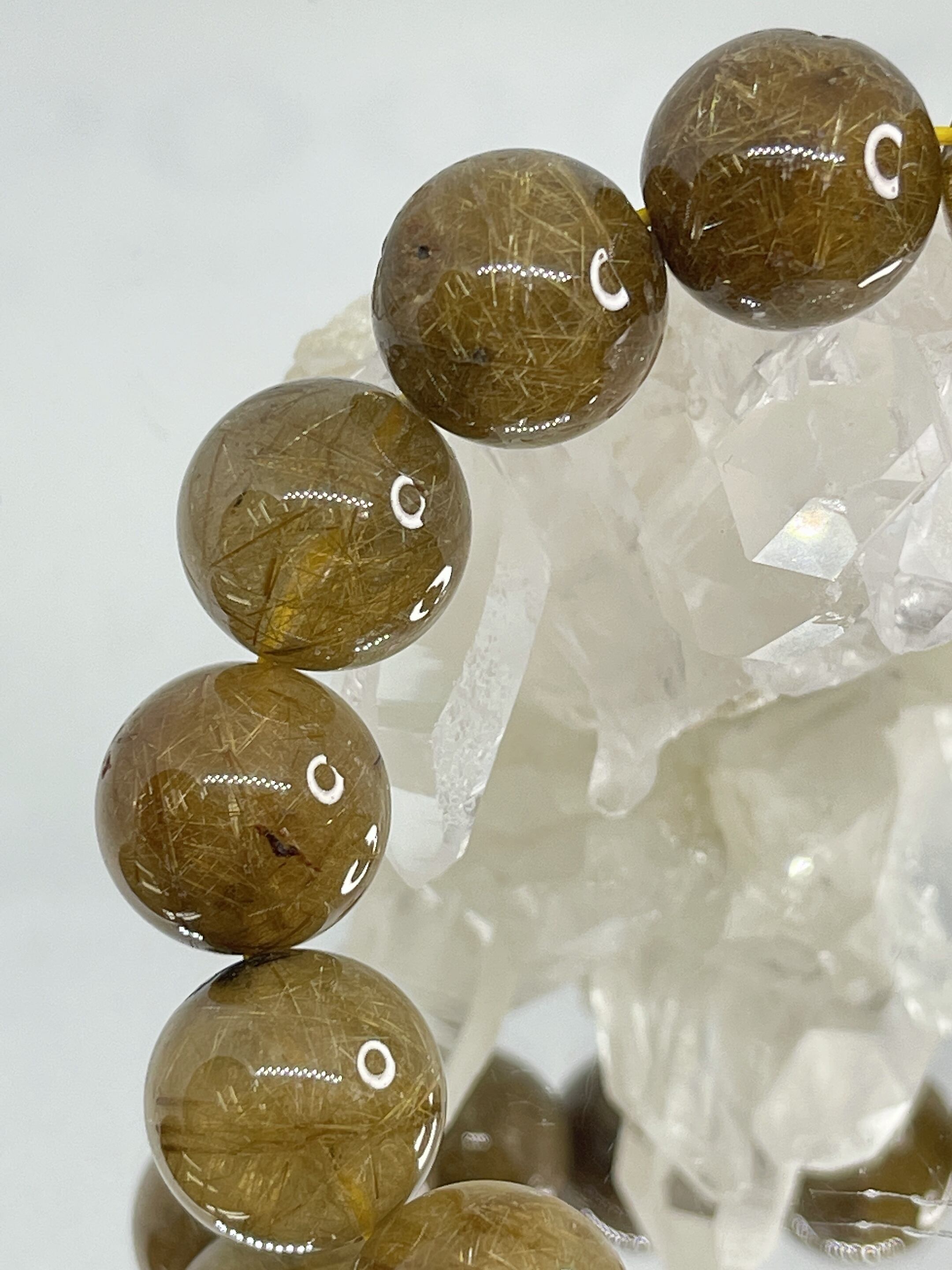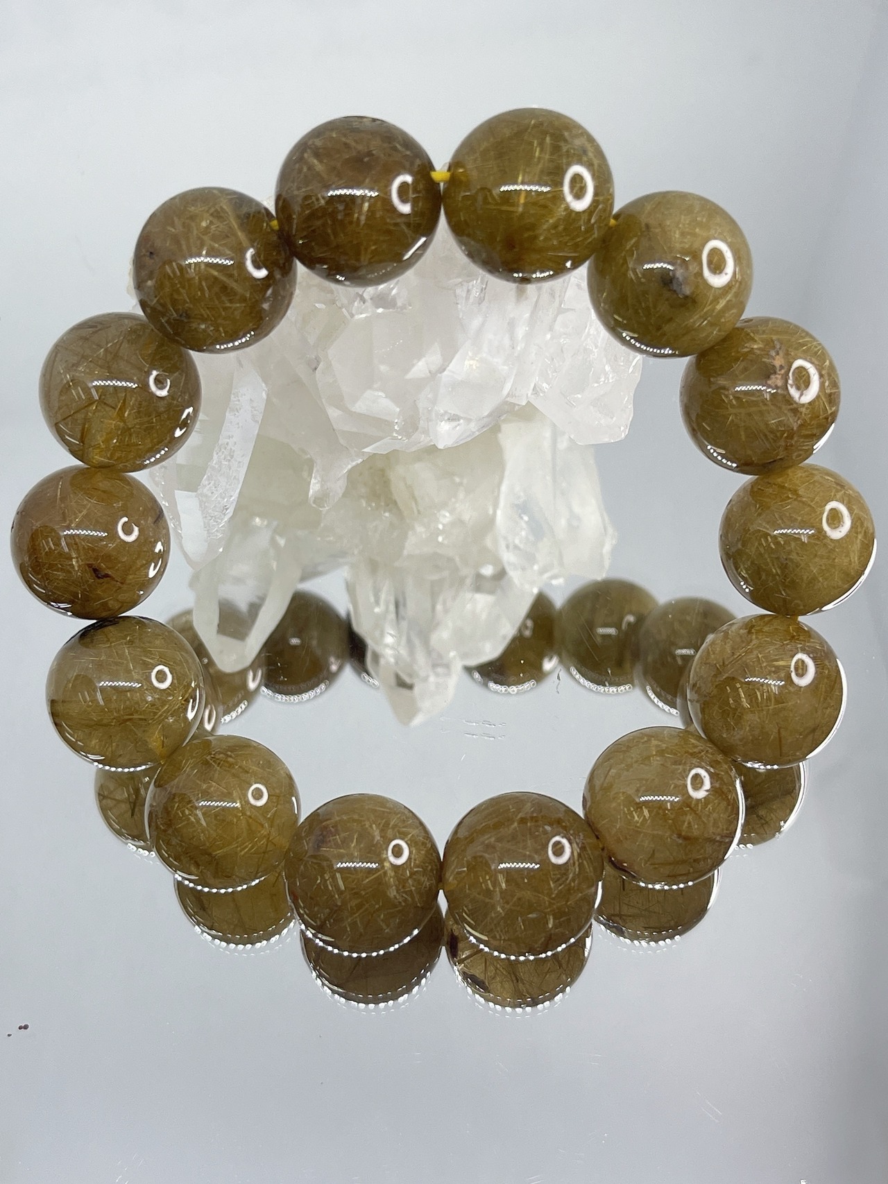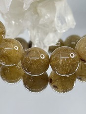 水晶の中にルチル(金紅石)を内包した天然石です。針状、または繊維状に内包され独特の輝きを放つのが特徴で、全体が黄金色になるものは特に人気があります。「金の線が入る」=「金銭が入る」ともいわれており、金運アップにもっとも力を発揮すると信じられています。