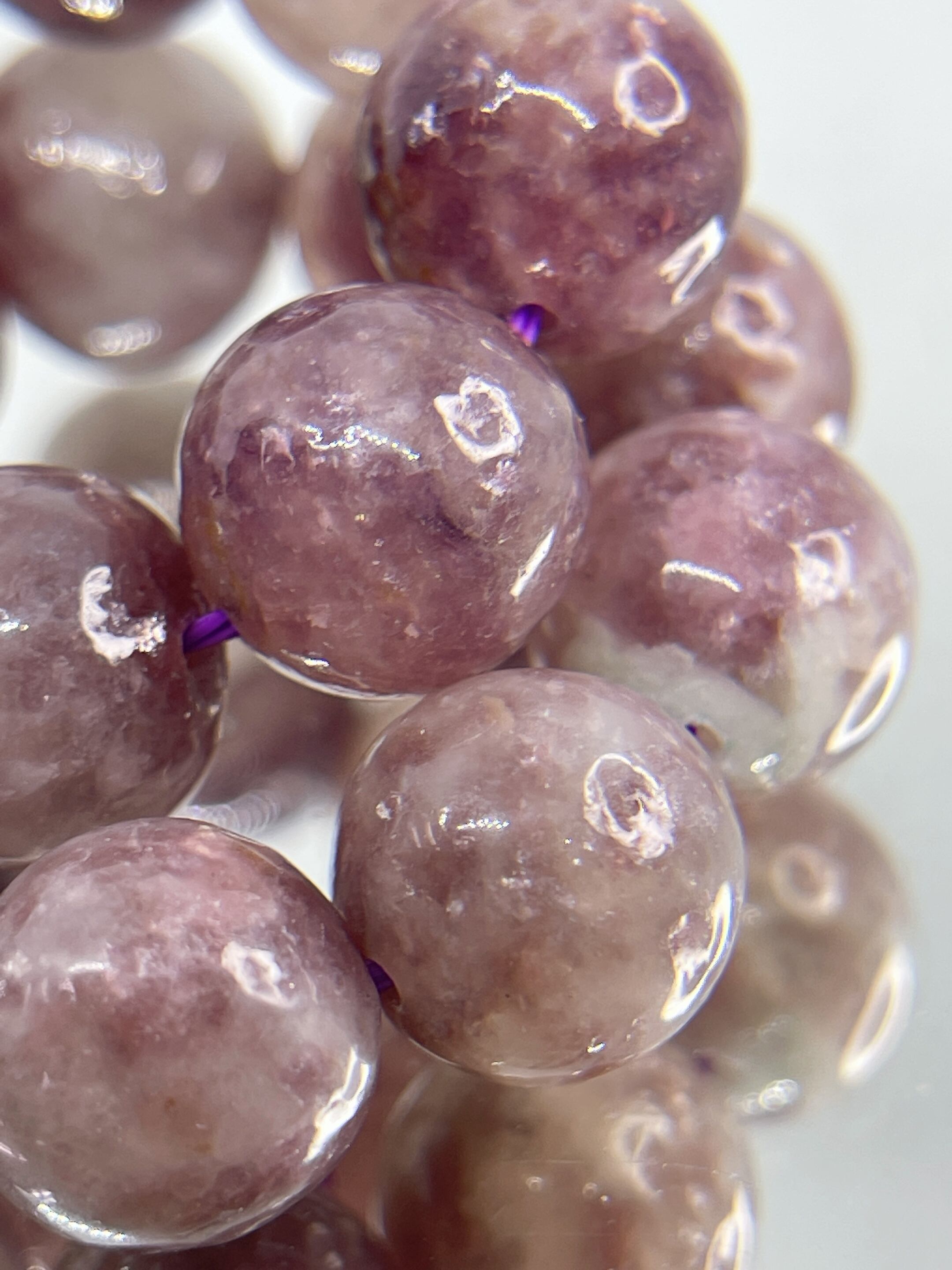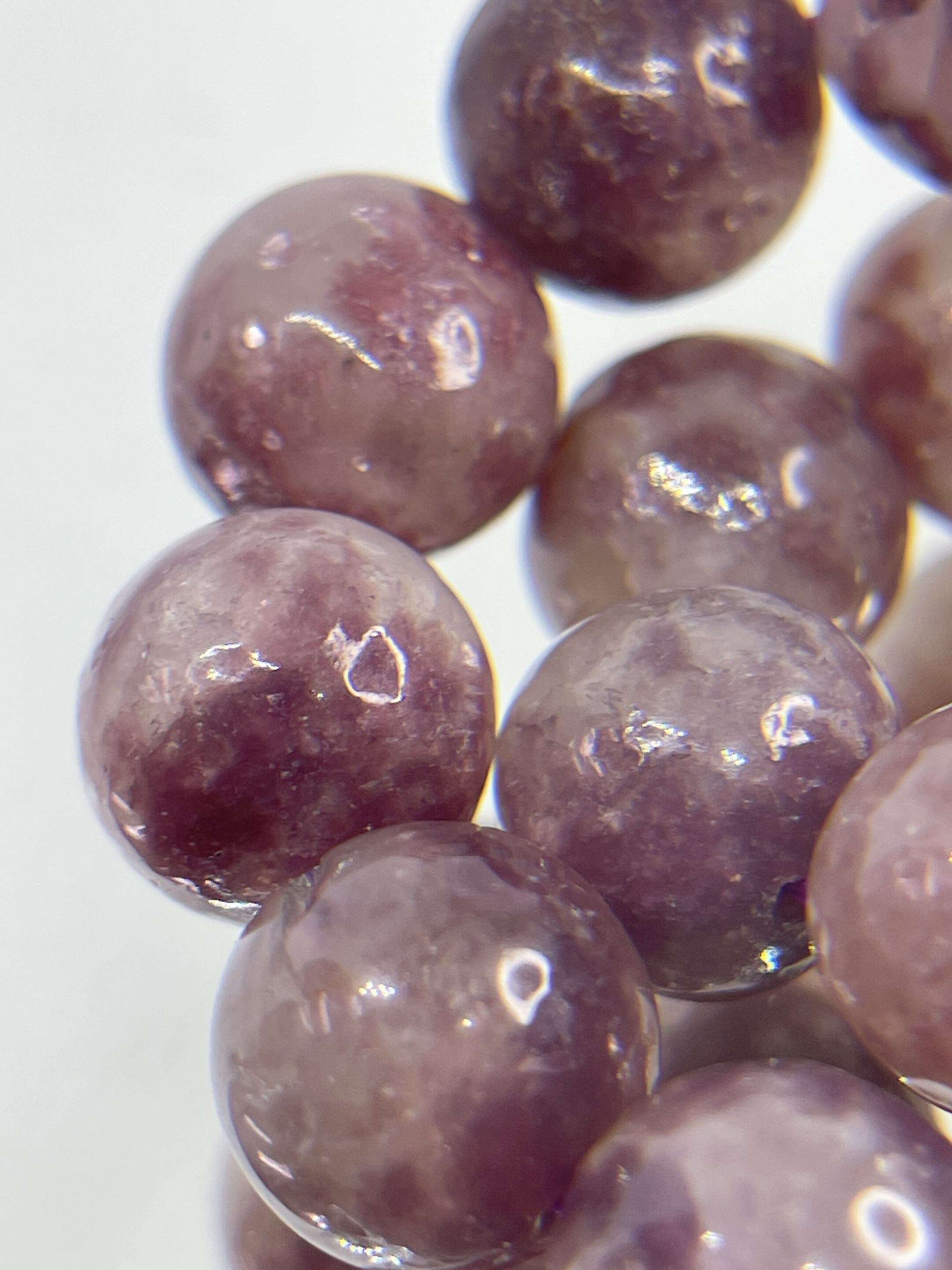 雲母(マイカ)にリチウムが多く入っている物がレピドライトであり。光沢のある独特な色合いは赤紫に近く、透明感があるものは良質で高価です。雲母がキラキラと輝き美しいいところも人気です。リチウムの含有量により、色は異なります。