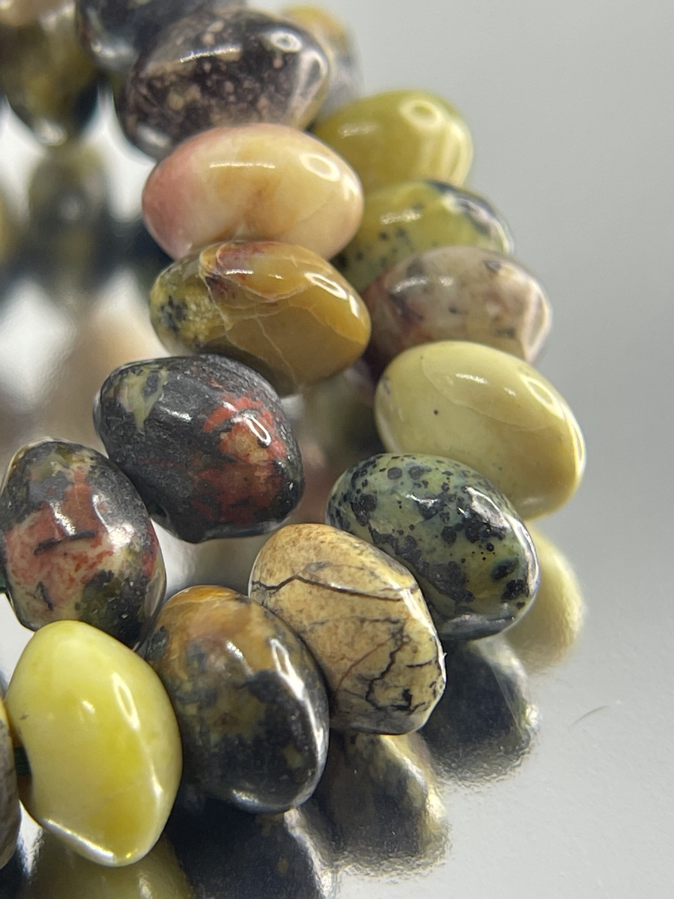 見た目がターコイズに似ている事もあるが、黒や茶色の内包物によって独特な模様があり、色合いも淡い緑から色鮮やかな緑色まで色とりどりです。