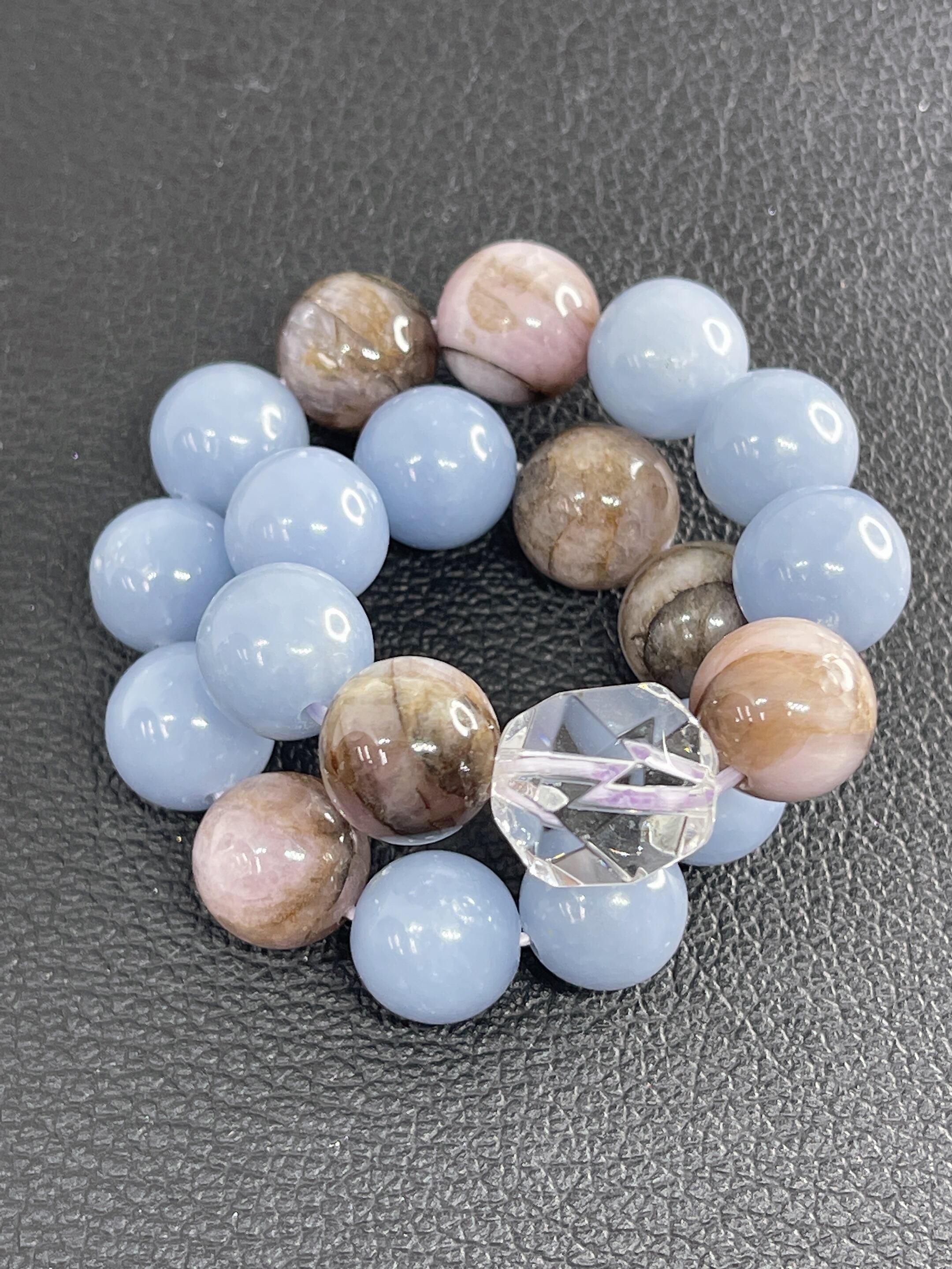 美しいマーブルカラーが示すように、芸術に関する力が強いクリスタルです。白のカルセドニーやオパール、紫のフローライト、ピンクのロードナイトなど、様々な鉱物を含む石でとても希少です。
