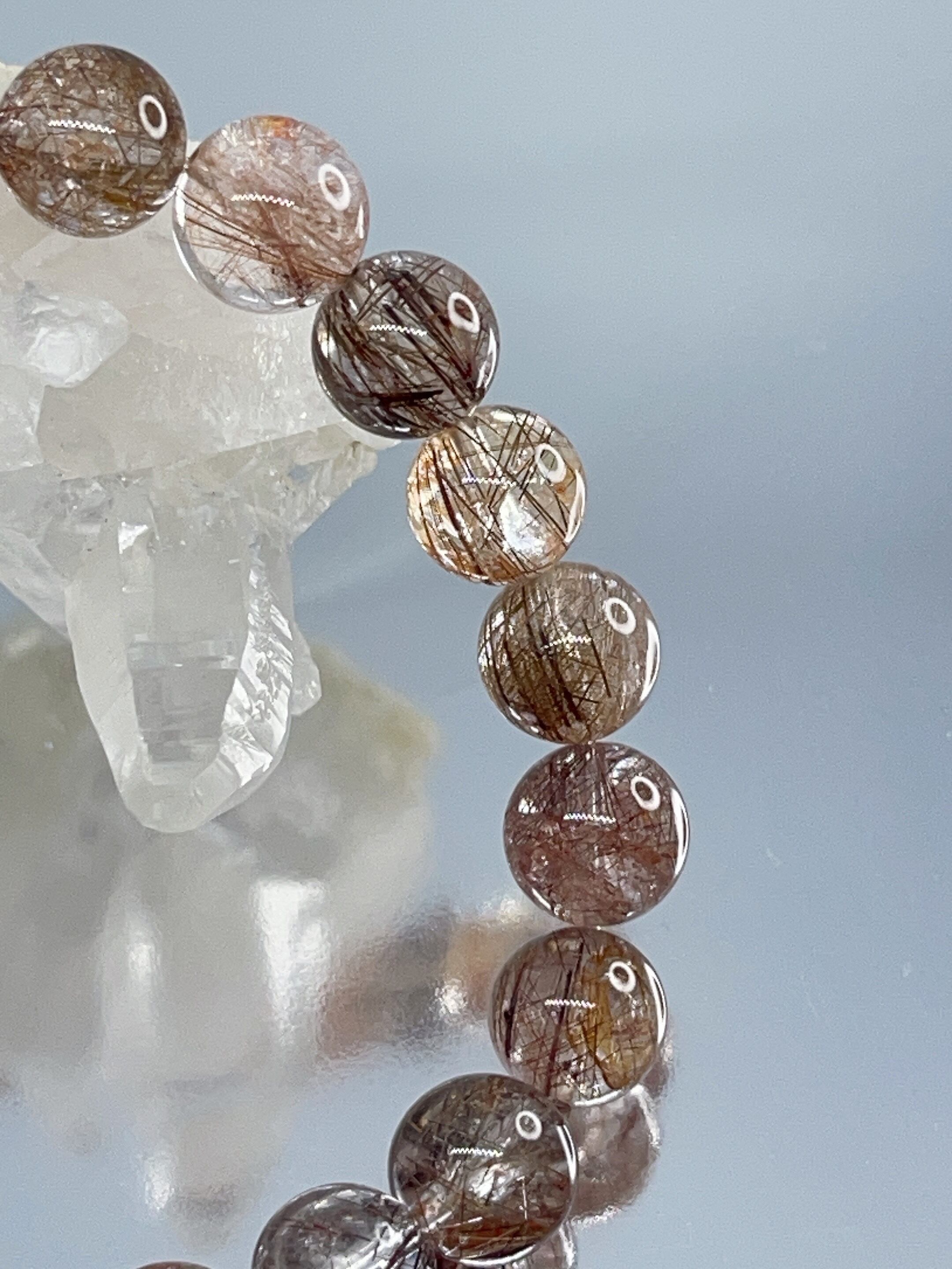 水晶の中に赤茶色や茶褐色の細い針状のものが内含されている石で、大きく分けても5色にわけられます。「ブラックブラウン」「レッドブラウン」「ライトカラー」「ダークカラー」「オレンジブラウン」の5種類があります。ゴールドルチルに近い強い活性作用を持ちますが、自分の意思を強くし、周囲の信頼を高める。これから稀少価値があがり、価格が上昇すると言われています。