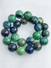 1つの石に、アズライトとマラカイトが混じったまま取れる鉱物で、別名「アズロマラカイト」とも呼ばれています。鮮やかなブルーとグリーンの色のコントラストがキレイで、細かく複雑な模様が美しく魅力的です。